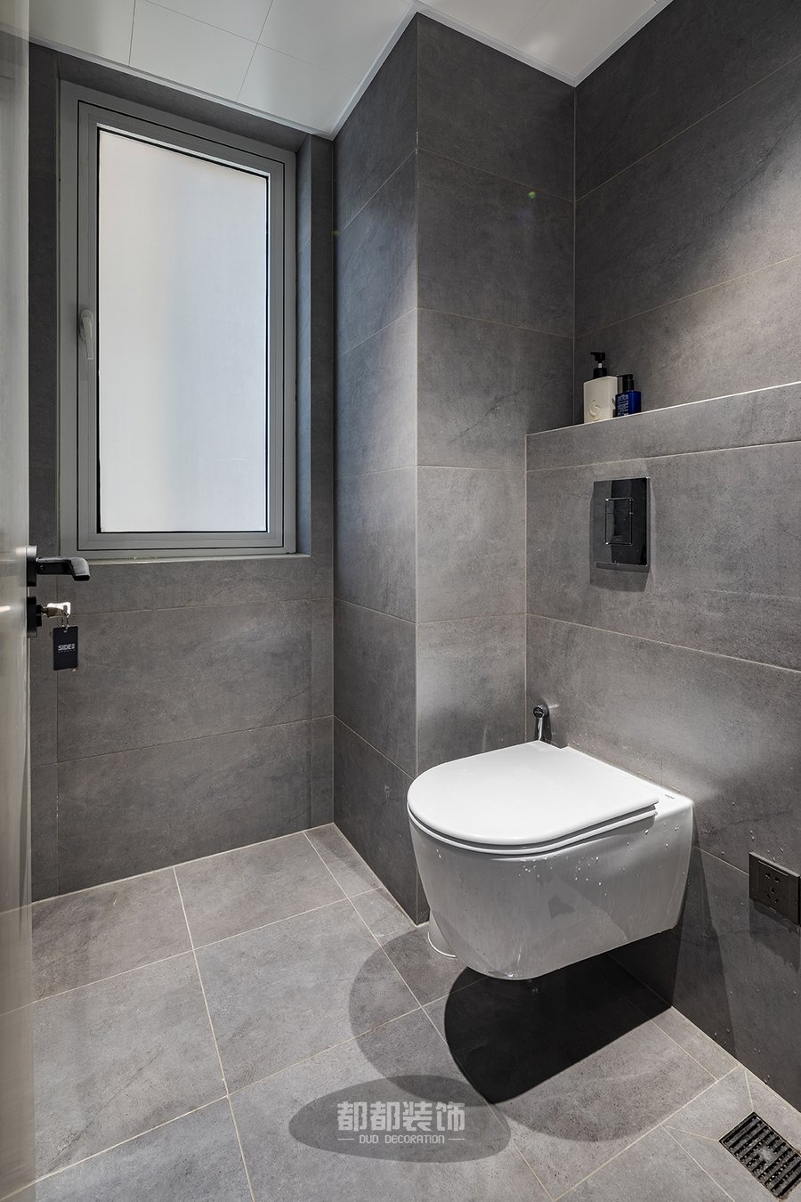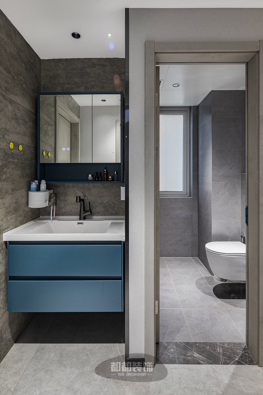 卫生间将墙体内推,干区外移,与走廊连通,减缓狭长走廊的压抑感,上台盆设计优雅大气,浅浅的莫兰迪蓝色让空间清新透气,窗户开在淋浴区一侧,采用全透明玻璃半墙隔断,不影响采光,离地智能马桶造型简约大方,整个空间仿佛VR中的效果图一样,还原度upup!