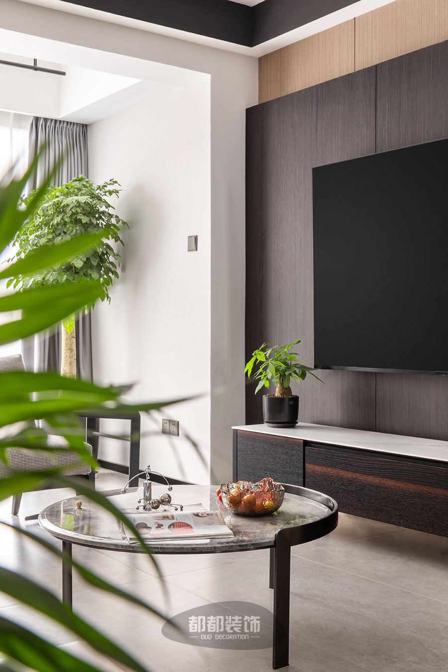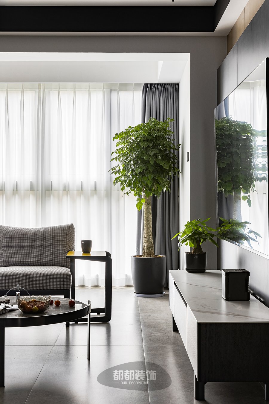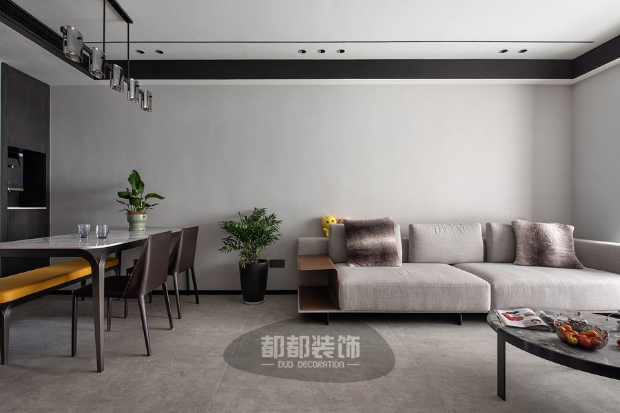 客厅空间黑白灰合理的搭配,再加上渐变抱枕、岩板茶几上的小饰品、绿植及灯光的点缀,让王先生的家一点都不觉得冷淡,反而更加有质感与纯粹。