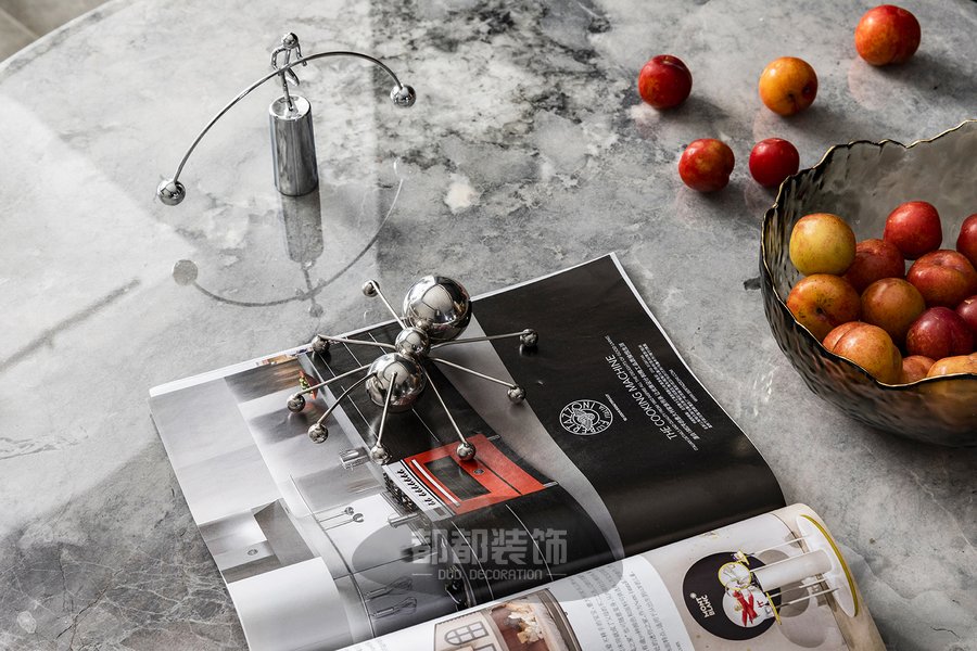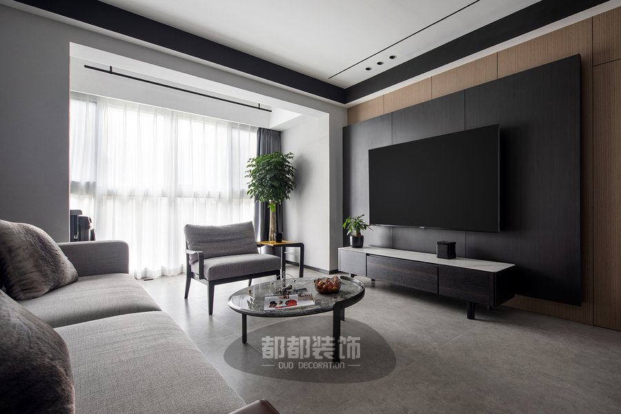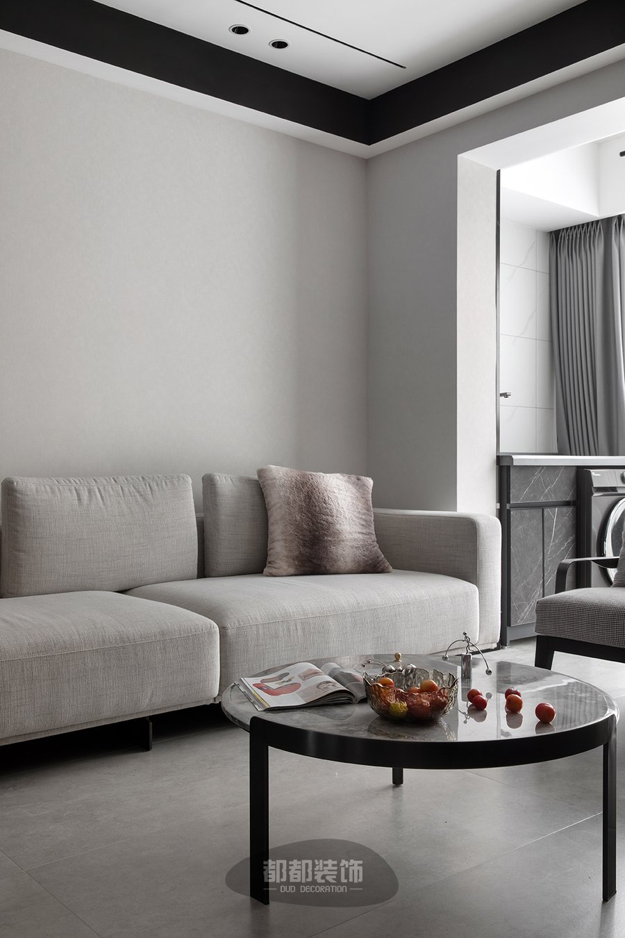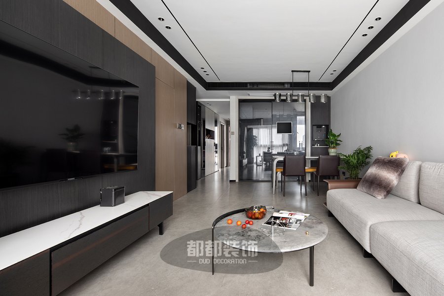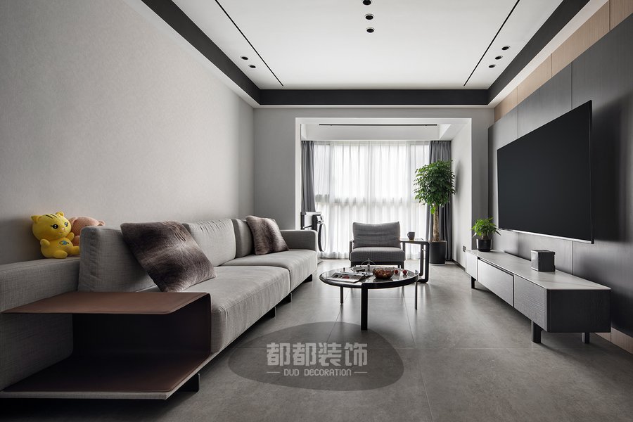 客厅空间黑白灰合理的搭配,再加上渐变抱枕、岩板茶几上的小饰品、绿植及灯光的点缀,让王先生的家一点都不觉得冷淡,反而更加有质感与纯粹。