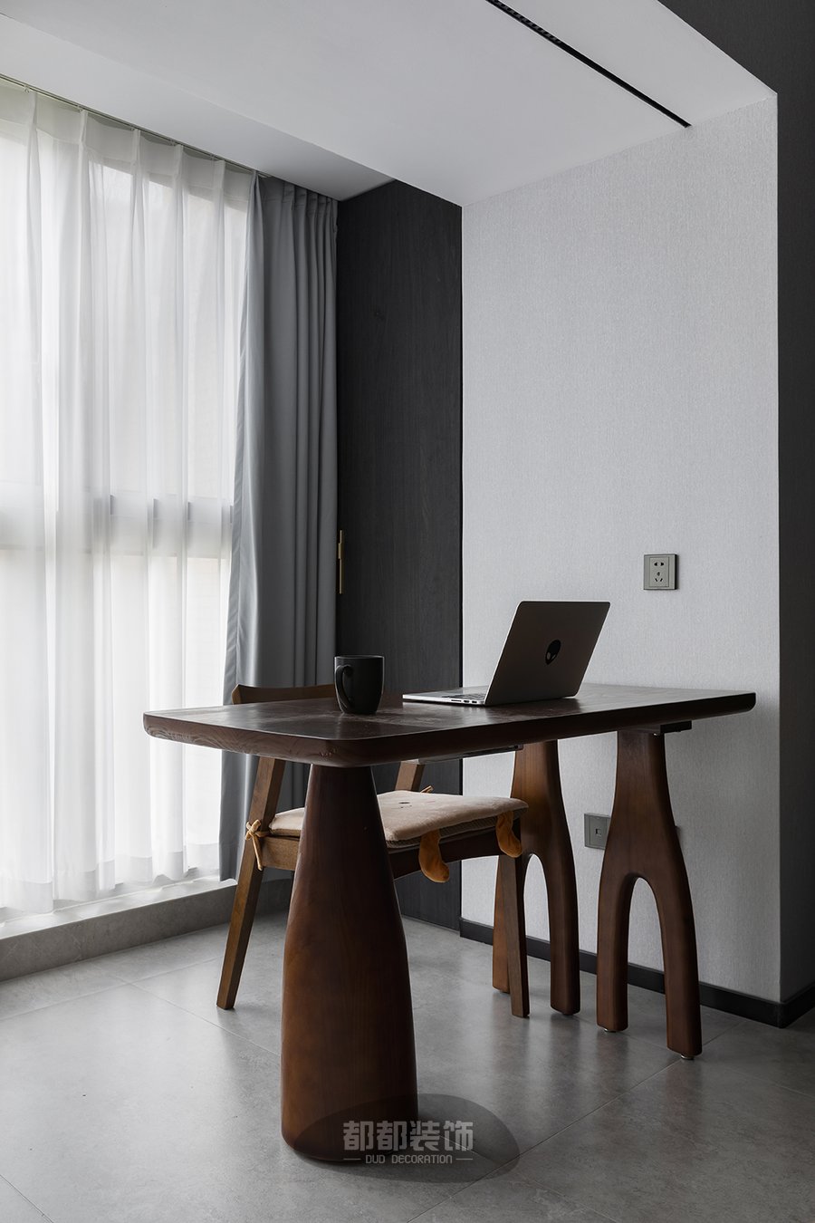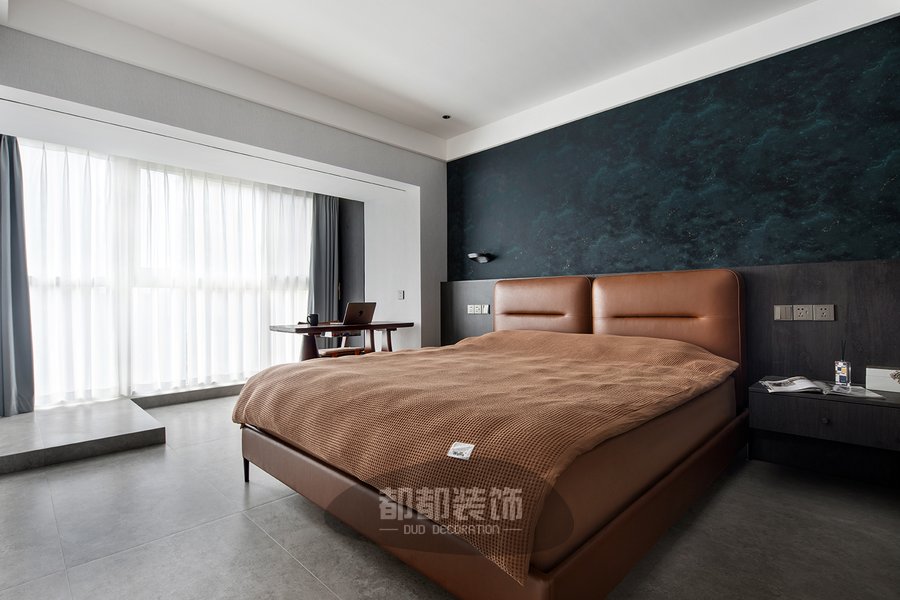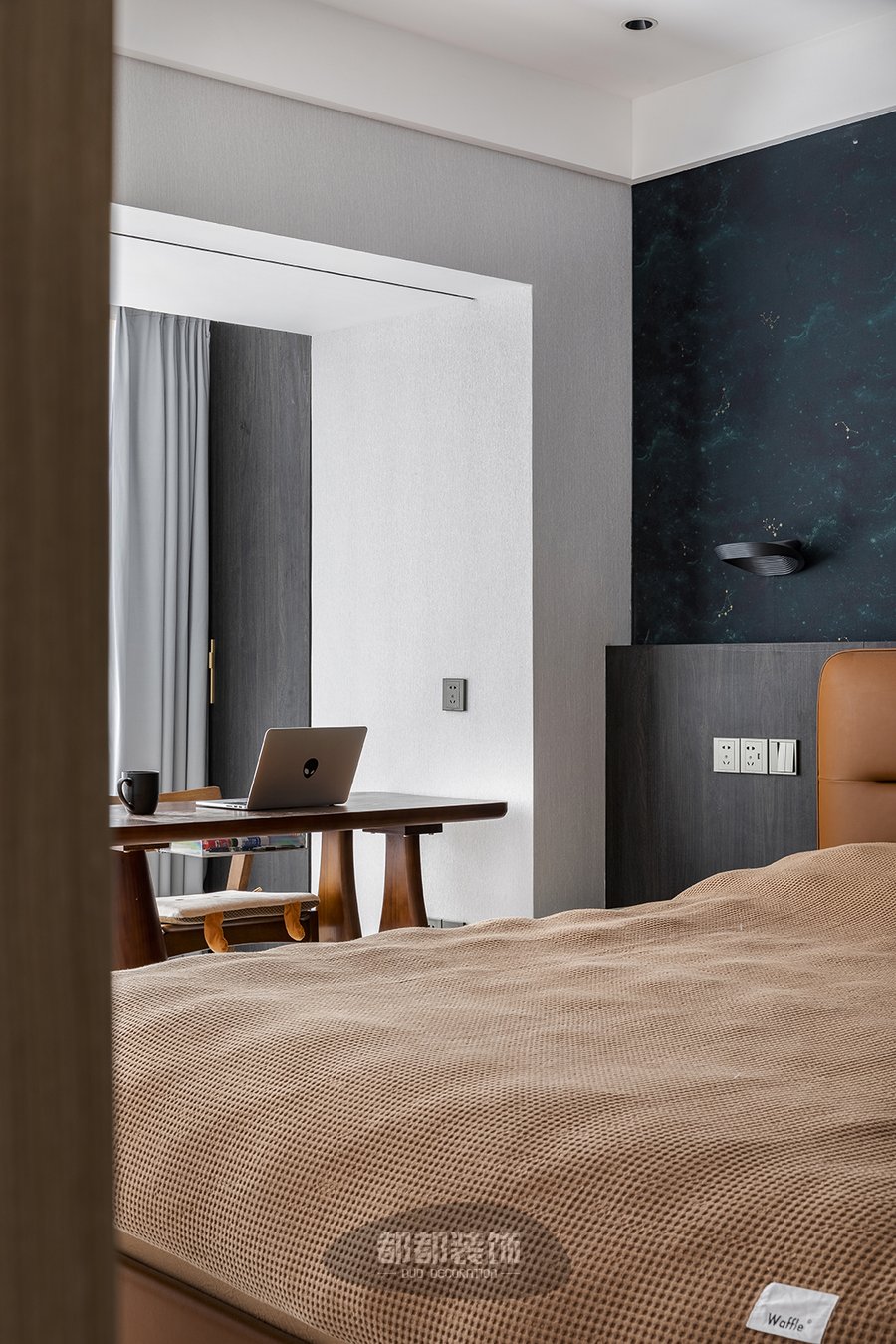 右侧床头柜是衣柜延伸出来的半隐藏式设计,造型百变又节省空间,靠窗放置的实木长方形书桌,异型的桌角设计创意感满满,在这里办公休息都很合适。