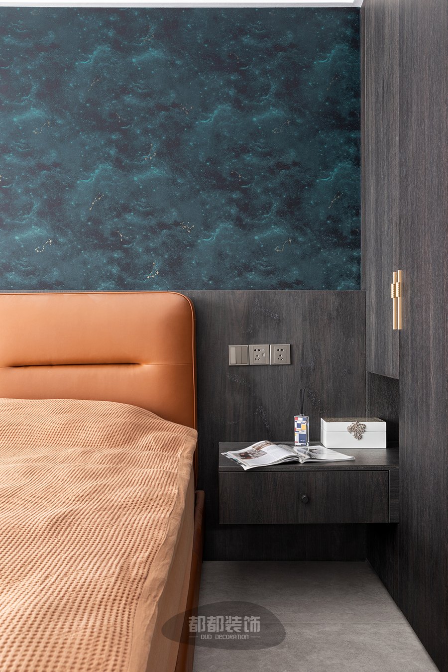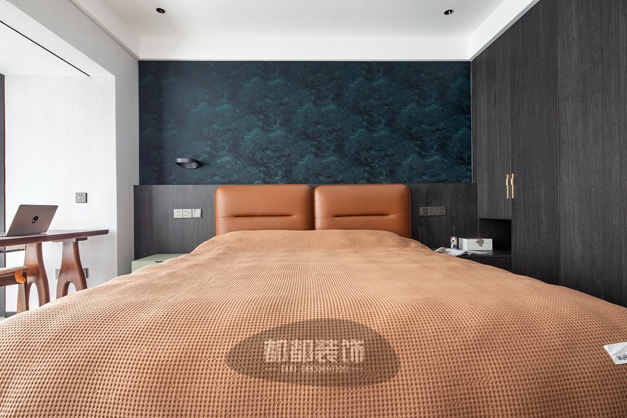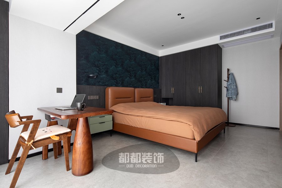 主卧大胆采用爱马仕橙+深湖绿的撞色搭配,衣柜的木饰面延伸至背景墙面,一半原木一半壁画,层次多样的同时也干净简约,搭配皮质软包床头板,让空间也显得简洁大气。
