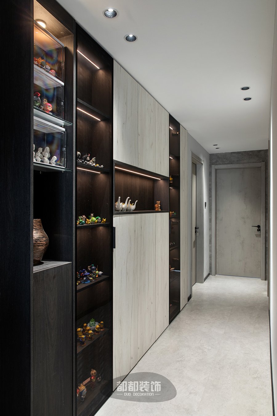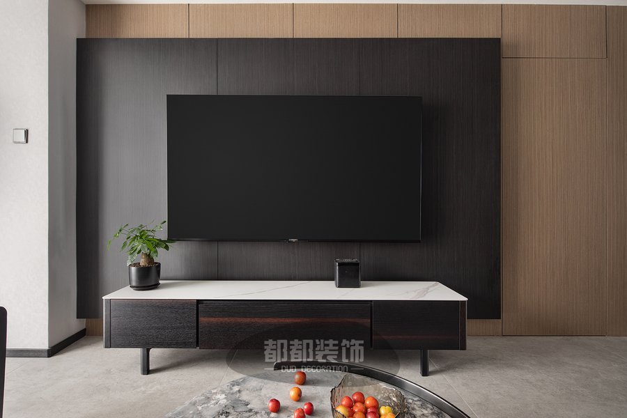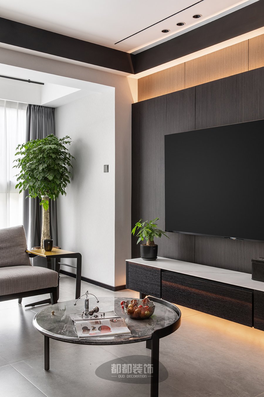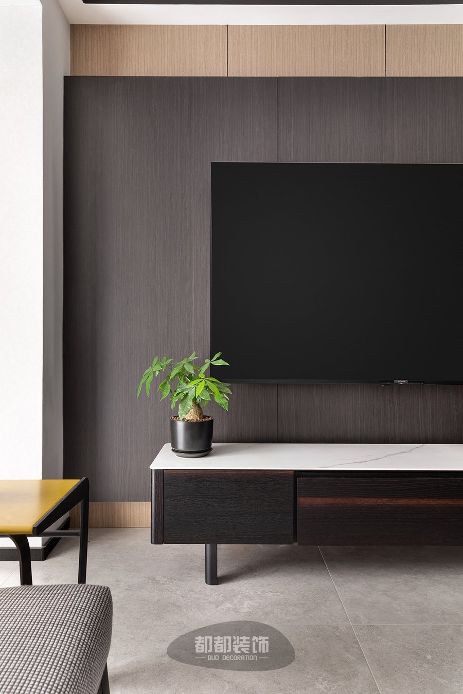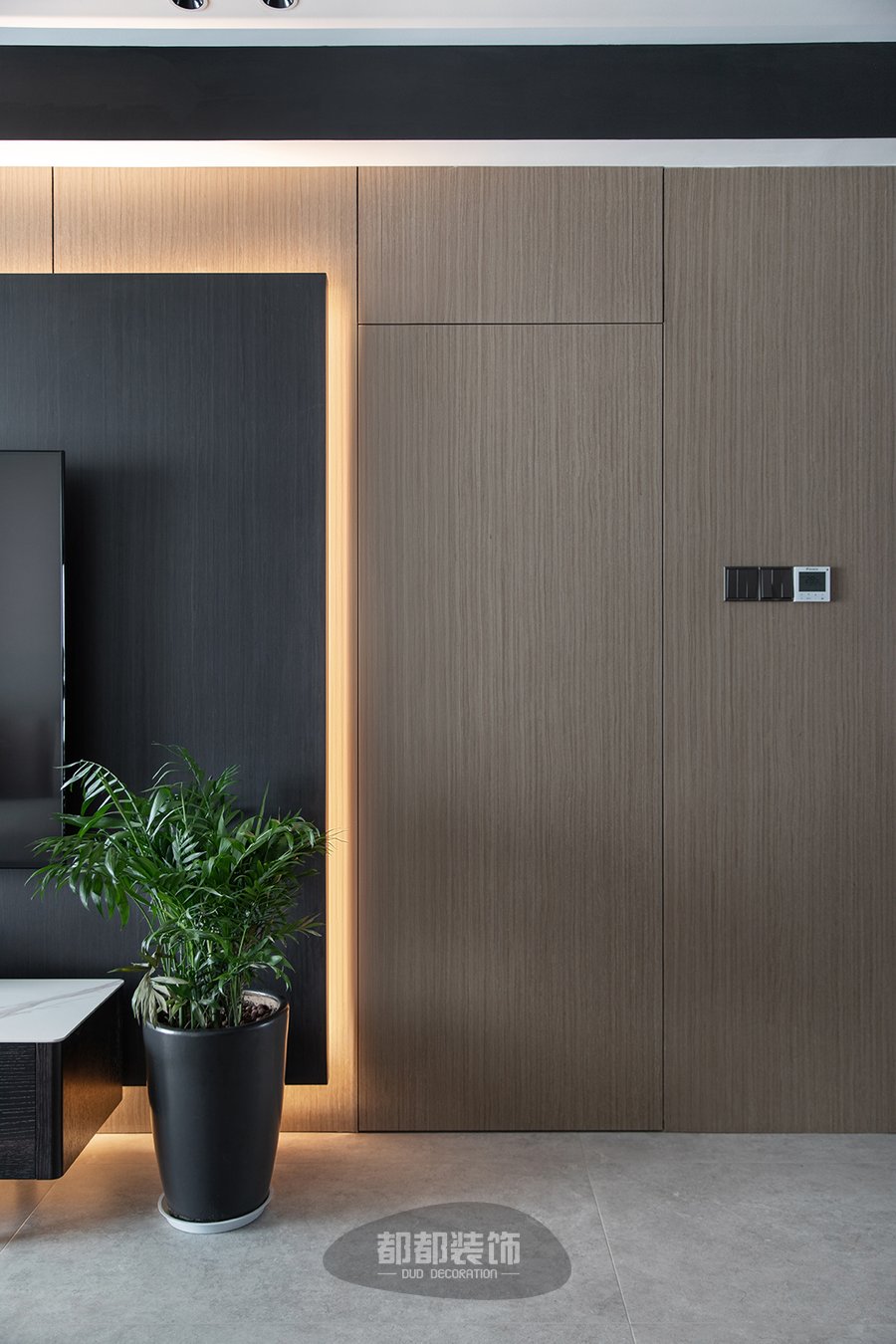 黑色低矮电视柜与木饰面完美对接,加之隐藏于背景墙内槽的灯源,时尚而个性。
