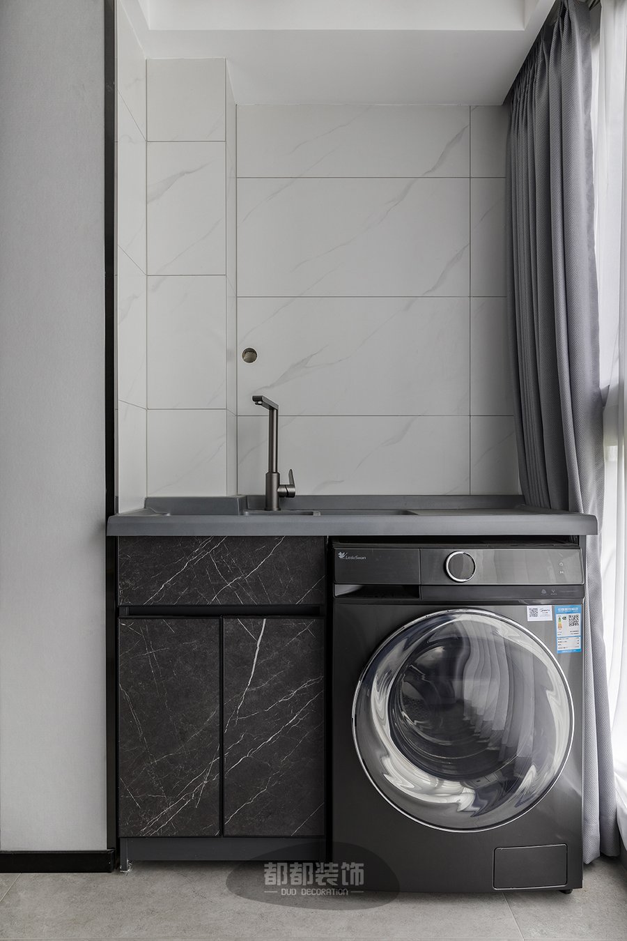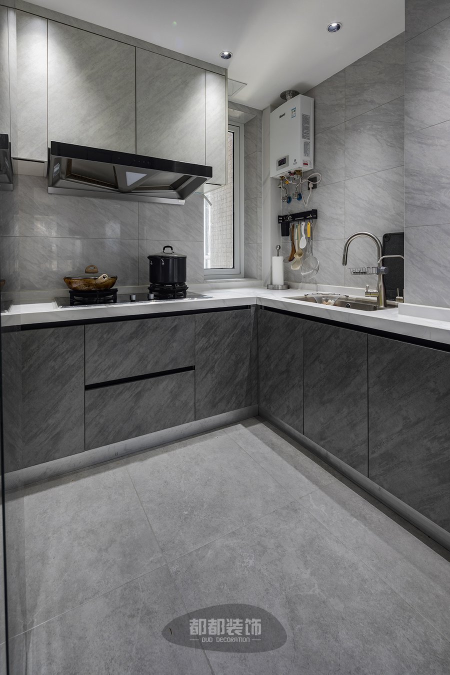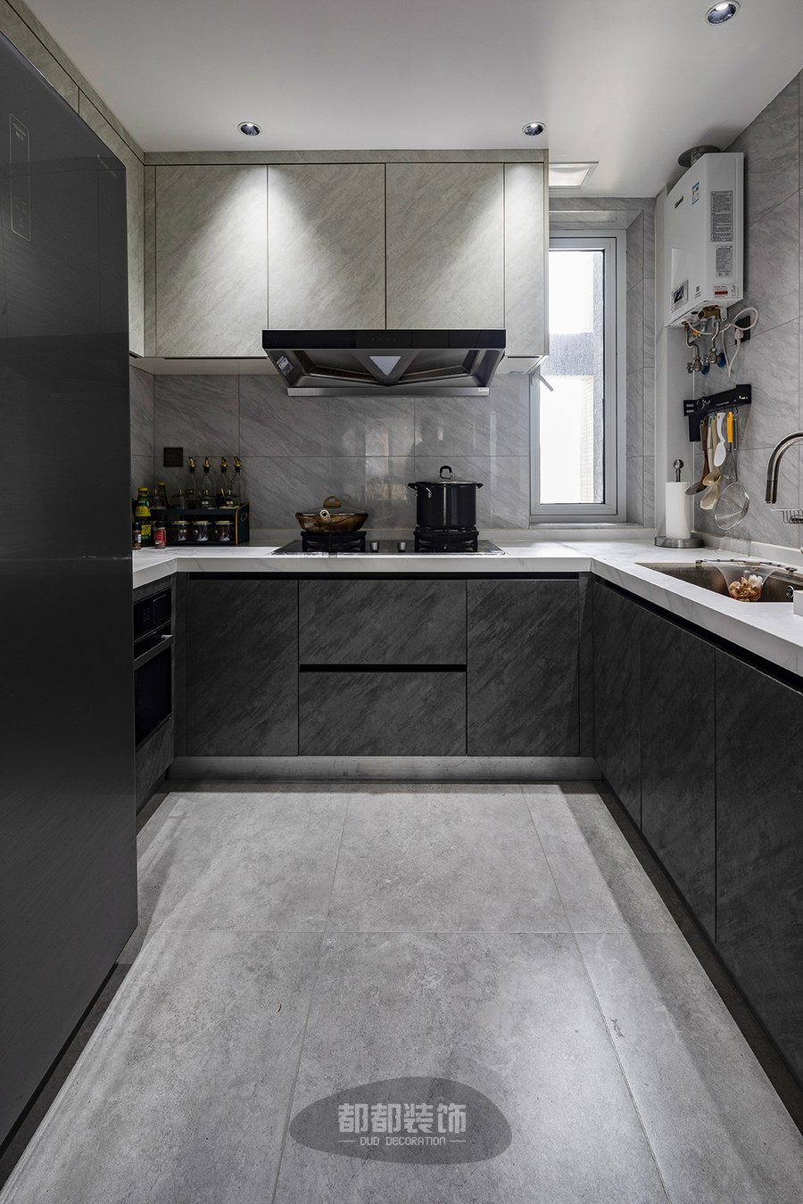 厨房整体为深灰色系,灰色瓷砖配合黑色美缝,耐脏好清洁,减轻了之前需要长时间打扫厨房卫生的痛苦,双开大冰箱靠墙放置,嵌入U字形布局的橱柜及操作台中,厨房空间被充分的利用起来,操作空间更宽敞,动线也更加方便。