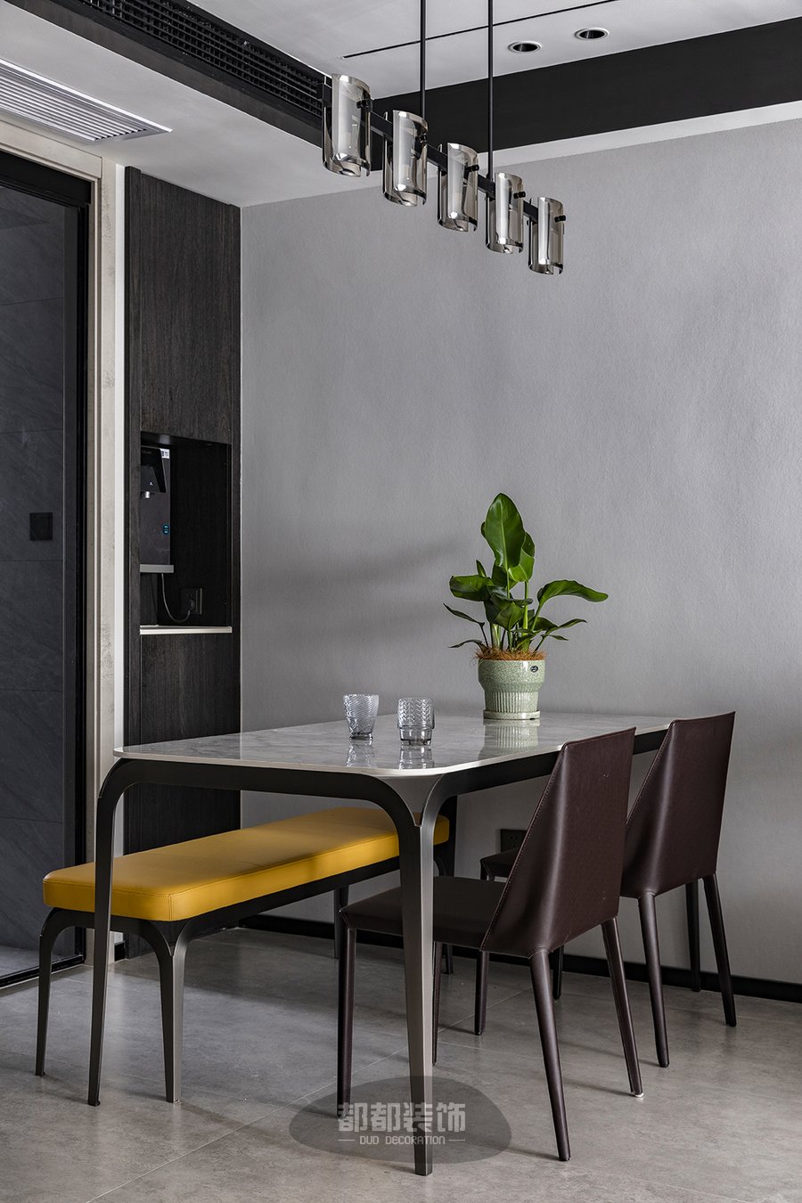客餐厅连通无界限,平面吊顶及吊灯一路延伸过去,视觉上增加空间纵深感,水云白岩板+黑木色桌角是绝配cp!多人位长条椅30cm的加宽座面设计,给人一种敦实舒适、四平八稳的幸福感,搭配上几张单人靠背椅,周末朋友来做客也不拥挤。