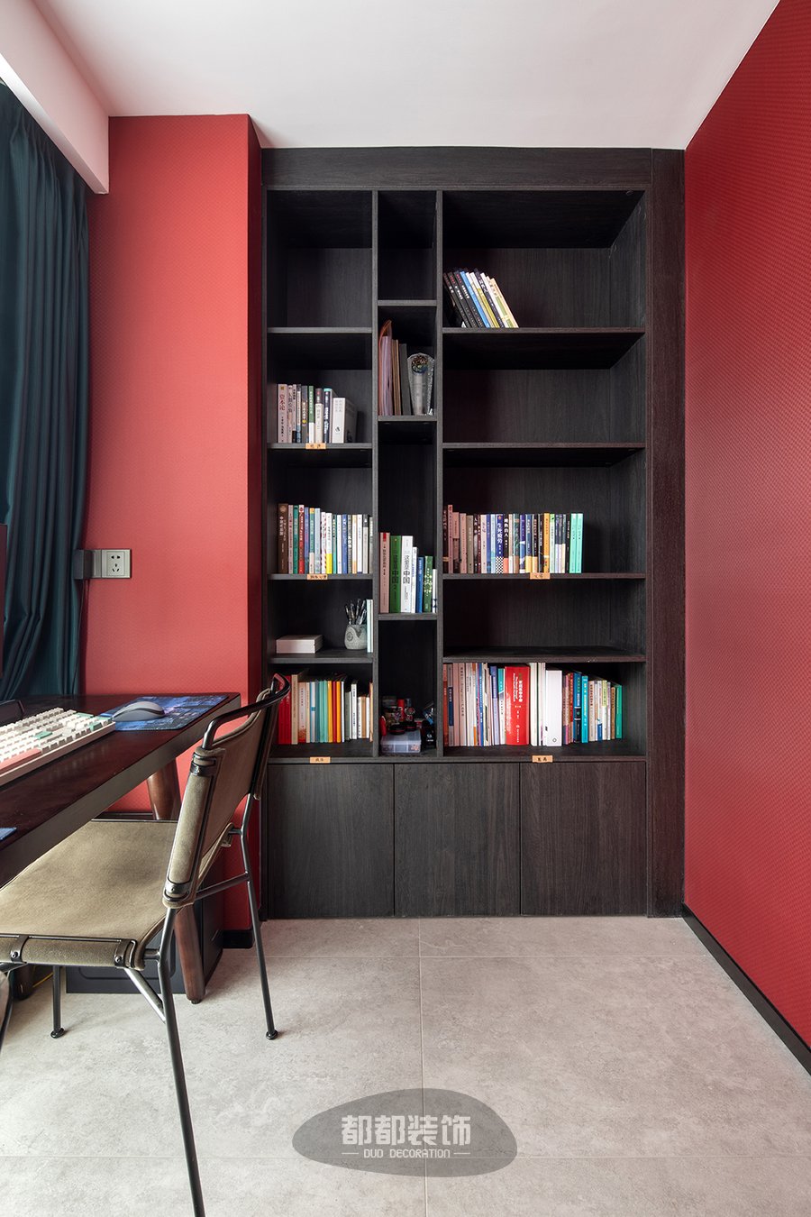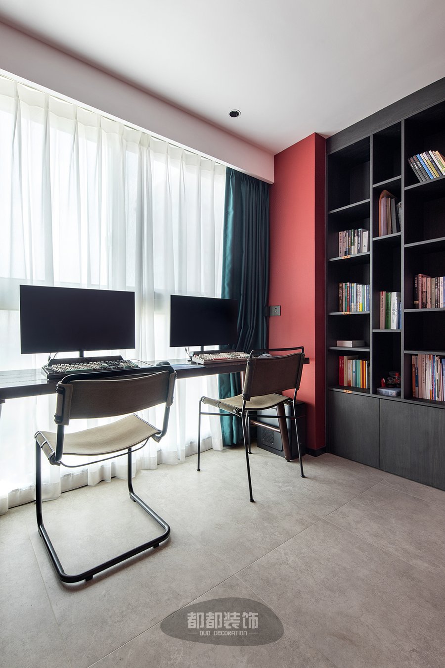 超长双人电脑桌配以帆布超弹性的椅面,就算长时间打游戏也不累,晚上关掉明亮的照明灯,打开墙上奇诡变幻的氛围灯光,一瞬间,整个房间色调完全改变,黑红配色的书柜亮眼醒目。