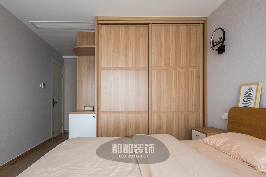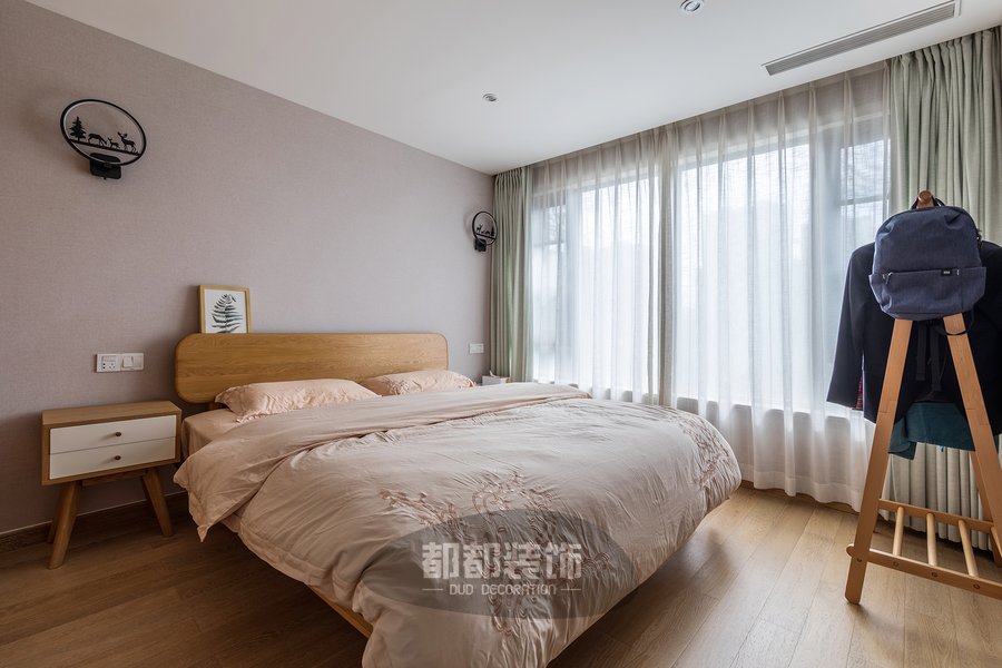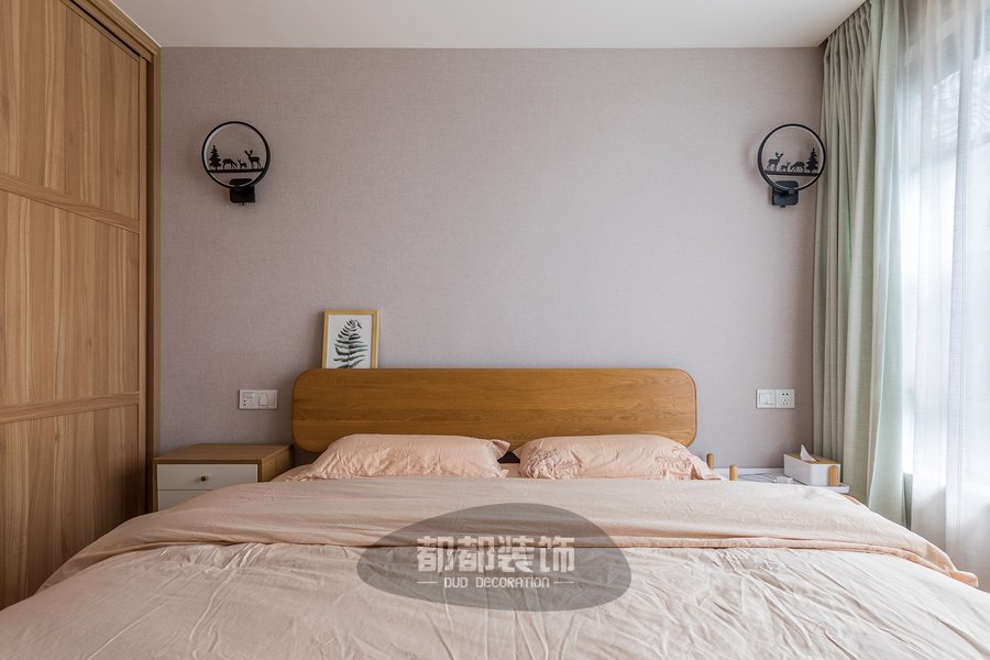 卧室内的家具搭配也延续了客厅木质的质感,少女粉的背景墙和四件套搭配原木色地板,让空间更加亲切舒适,温润的床品让空间多了一份宁静。