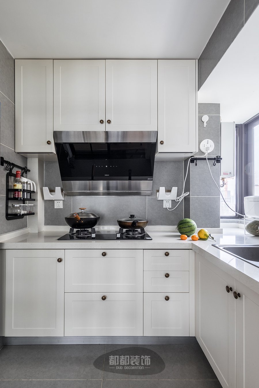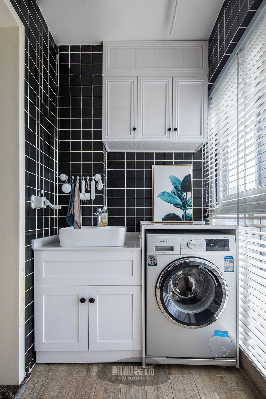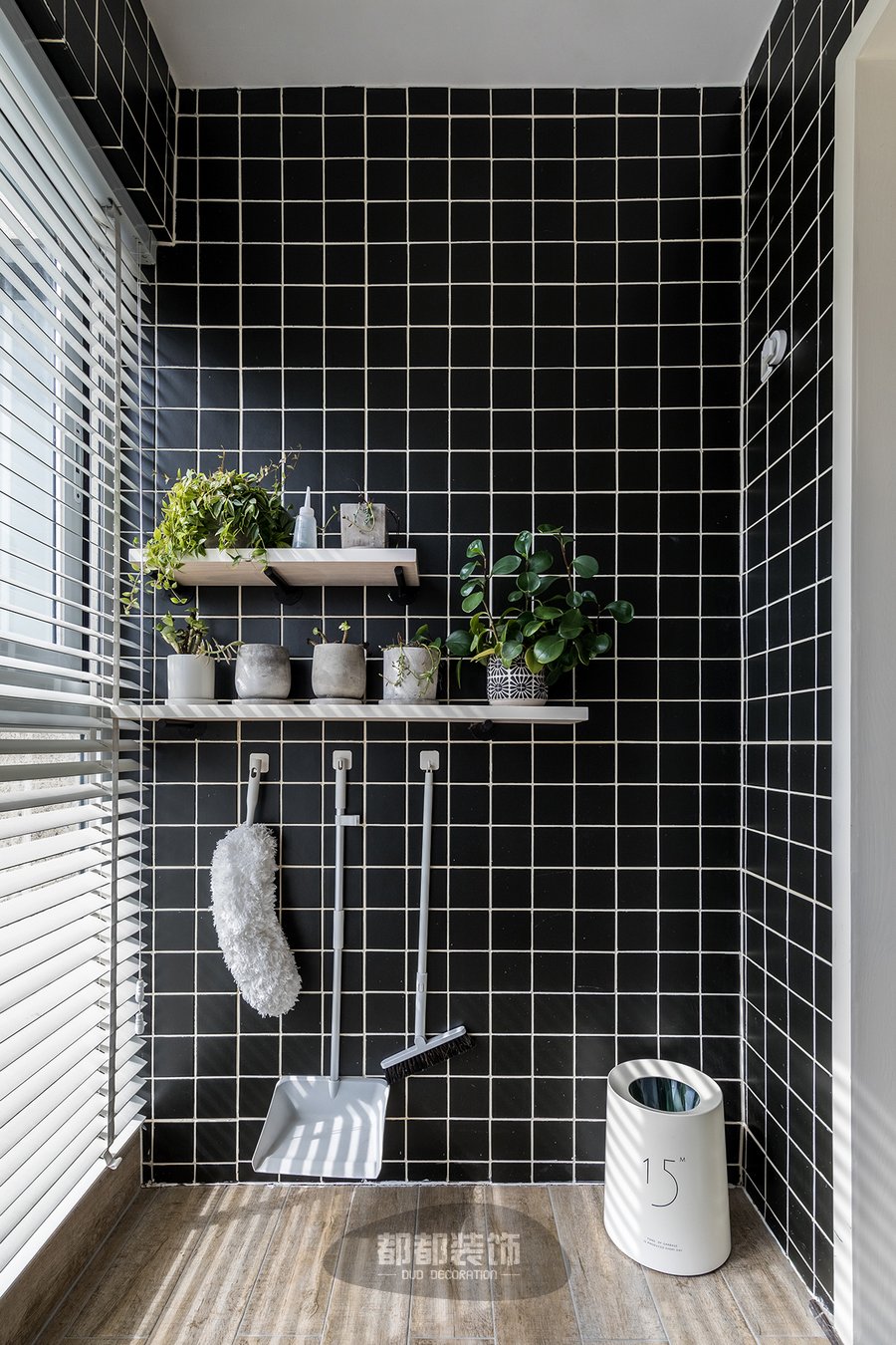 小黑砖+白色美缝是北欧风套餐里的“尖子生”,在黑白格的背景下,随便配上白色吊柜、装饰画、新鲜小绿植是不是有一丝的百万网红家的韵味?刷子、毛巾、扫把、簸箕统统上墙挂放空间一点没浪费,滤水晾干都不在话下!