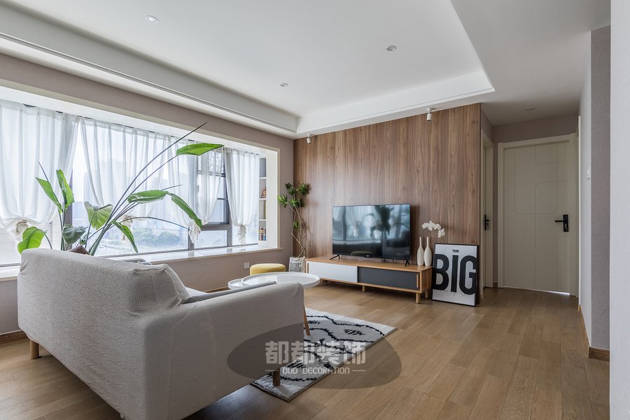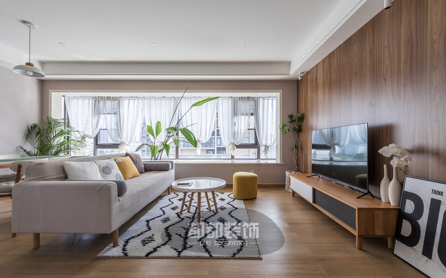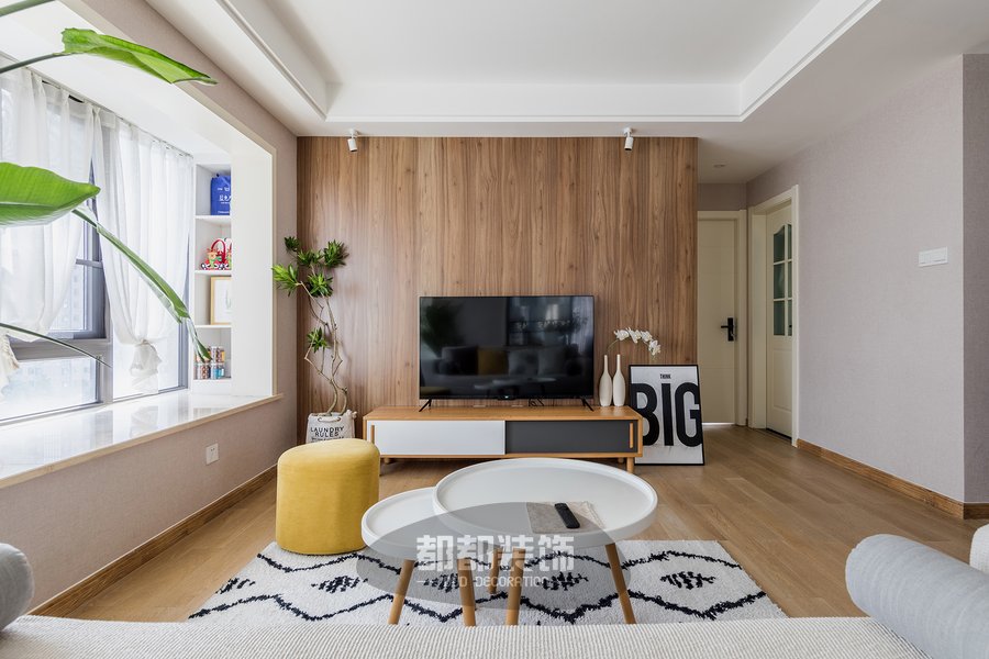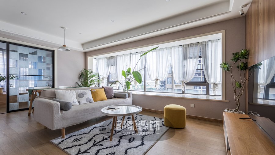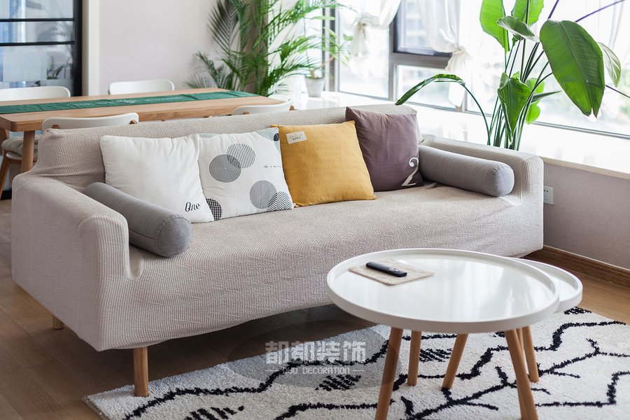 绿植与布艺沙发色调成对比,突显空间的灵动性,奶呼呼的珊瑚绒地毯温柔又小清新,摸着很舒服,通气性也没得说,全屋动线区通透明亮,舒适美好。