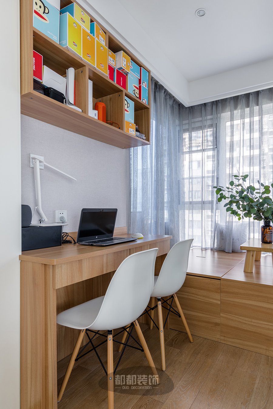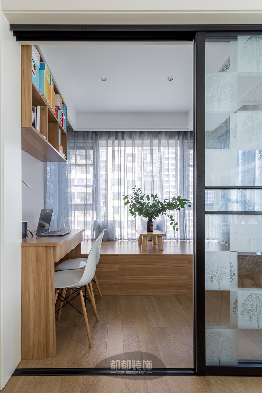 四周玻璃墙搭配淡蓝色纱帘,需要安静私密的办公空间也可以轻易满足,玥玥说在这个环境工作学习效率都提高了~