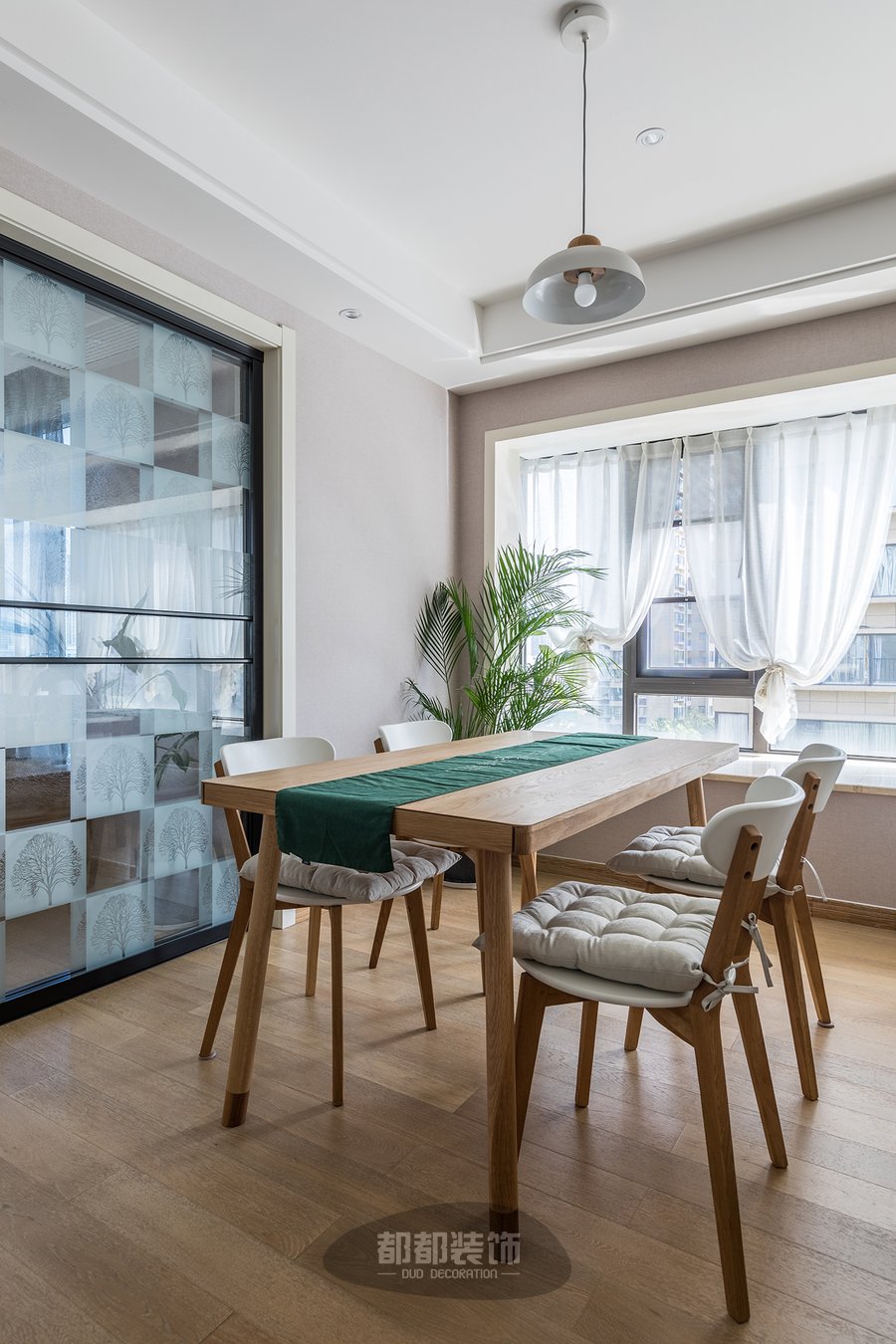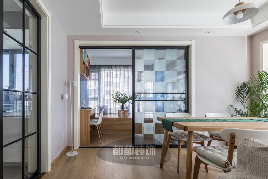 沙发后面就是餐厅了,因为一个人住,所以餐桌挑选轻盈小巧的木桌,玥玥女孩子一个人也方便挪动,灵活可调;比邻的玻璃厨房门毫不影响空间视线,让家里各个空间的互动性和联系感更强,墨绿色餐桌布搭配原木色超级清爽有没有!