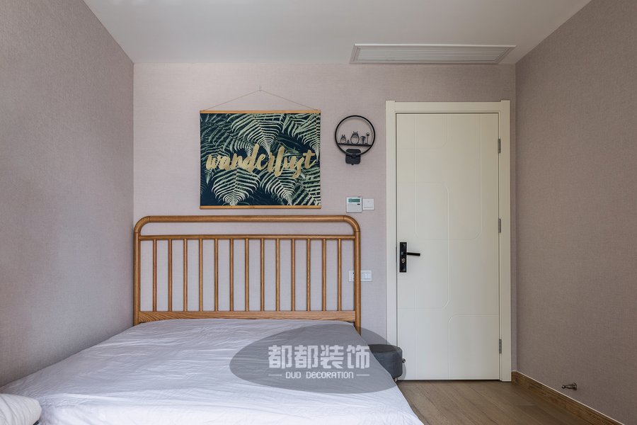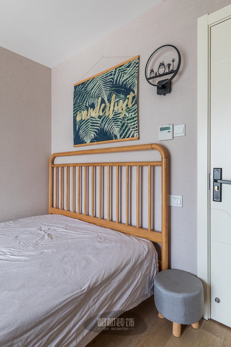 次卧依旧是以简约北欧风为主,纯色墙面辅以植物图案装饰布画,让睡眠空间气质更加温和有质感,铁艺壁灯与主卧的壁灯相得益彰,龙猫可爱生动,整体空间简单又不失温馨;圆墩墩的床边凳即可以方便换鞋也可以临时放置遥控器等小物品。