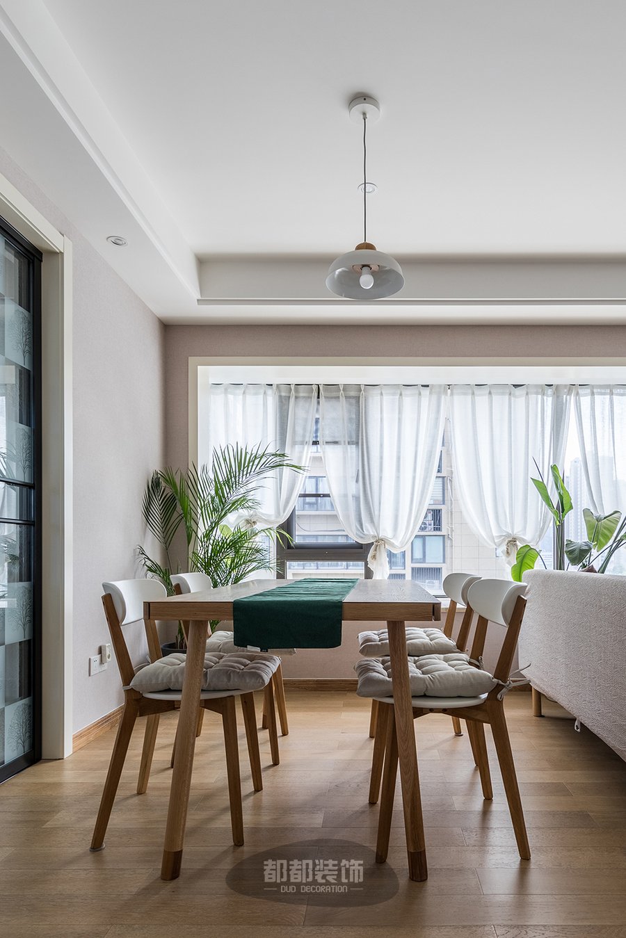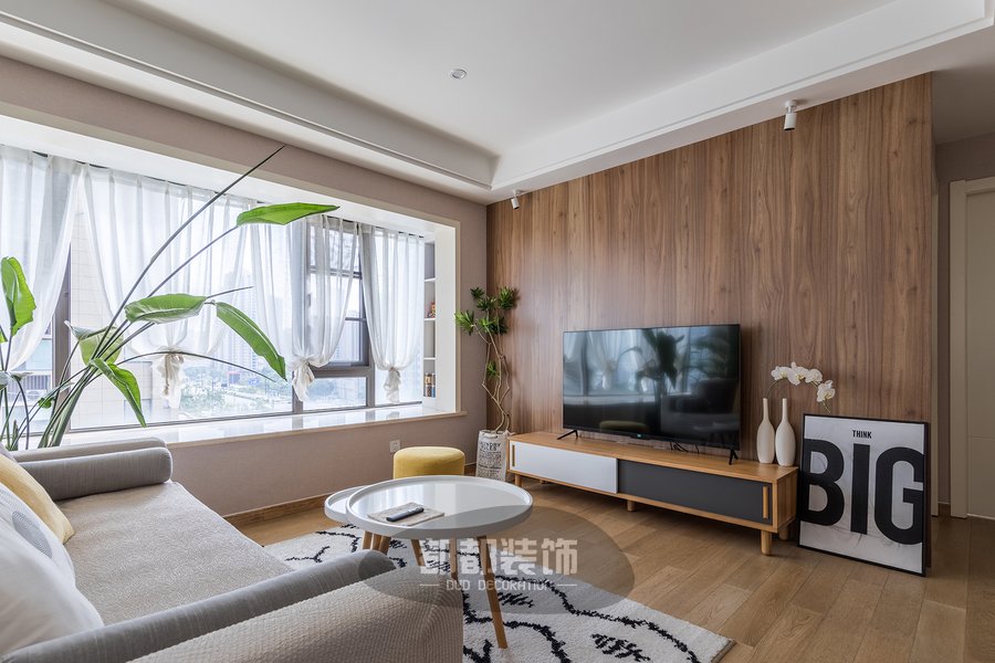 材质方面选择木制,棉麻为空间的主要软装材质表现,再辅以绿植作为点缀,体现整体质感。