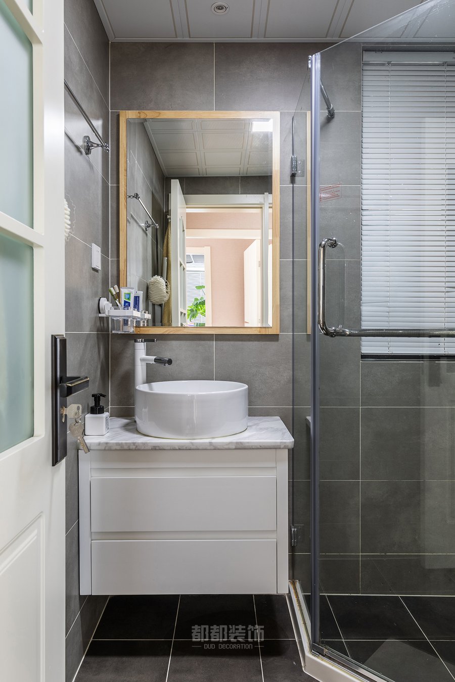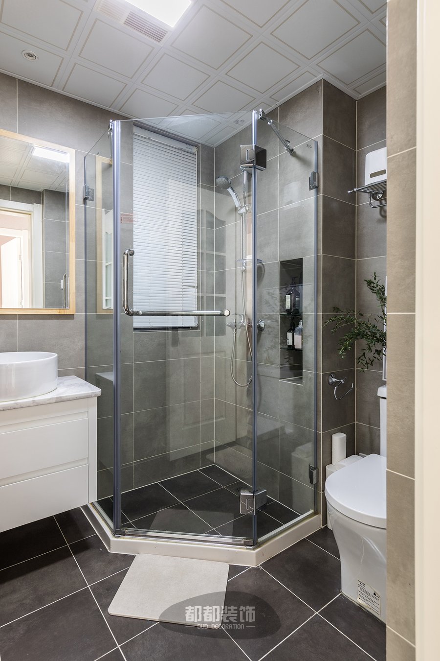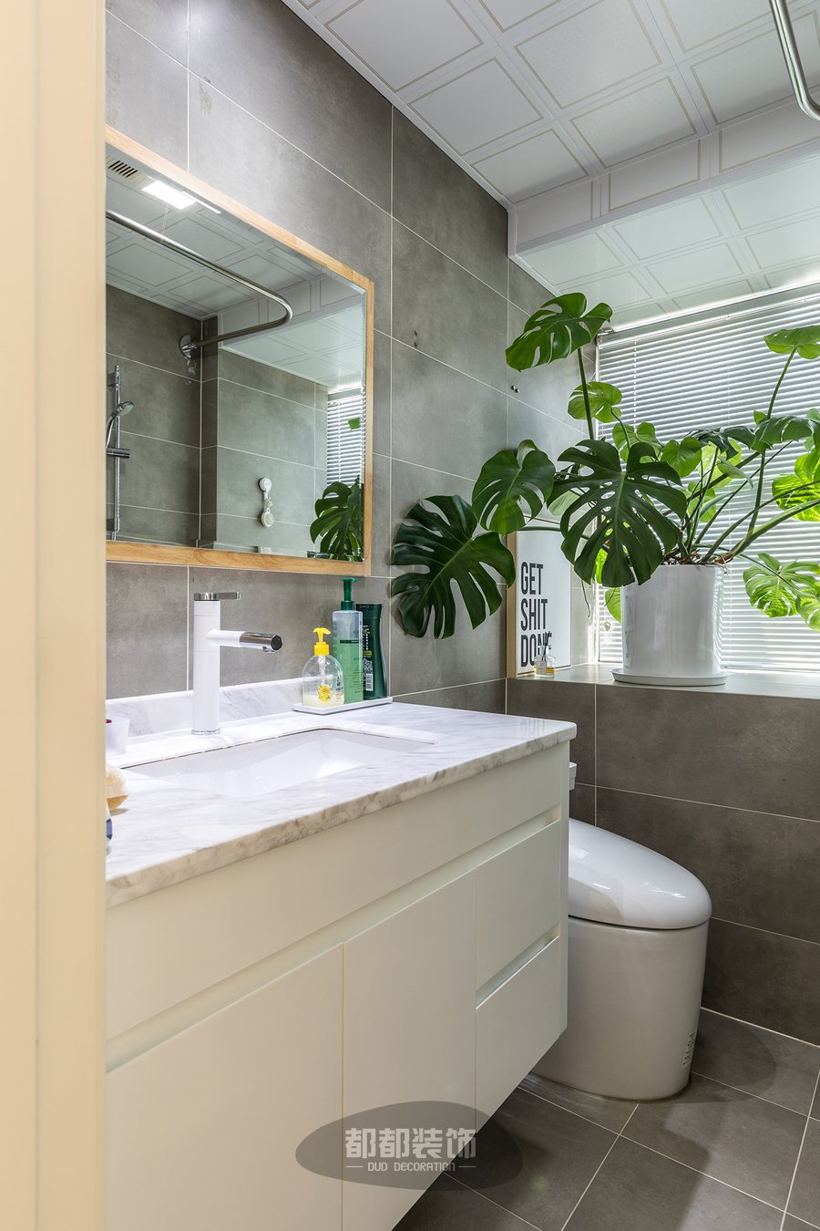 卫生间一如高级灰白色为主调,梳妆镜以少量木质作为边框点缀,大盘龟背竹给空间带来了活力与生机。