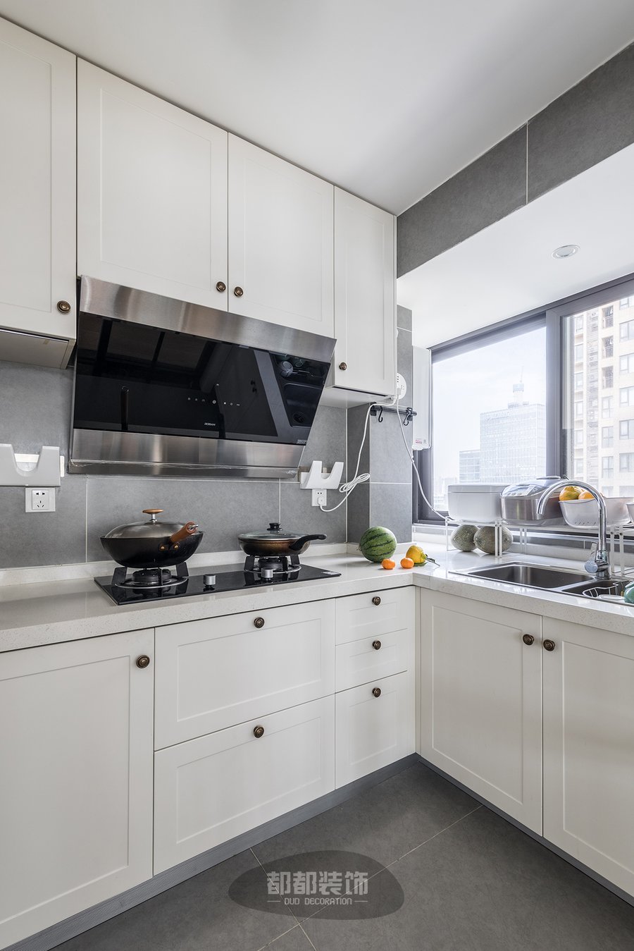 通过餐厅来到厨房,经典白色橱柜款式永远不会过时,简约的线条感和圆形铜色拉手柜门让视觉更为清爽,即使站在餐厅,看向厨房也会觉得大气时尚;左侧靠墙处是玥玥的调料区,液体调料生抽、粮油等放在上层,粉状食盐、胡椒粉放在上层,一个人煮饭也要有仪式感。