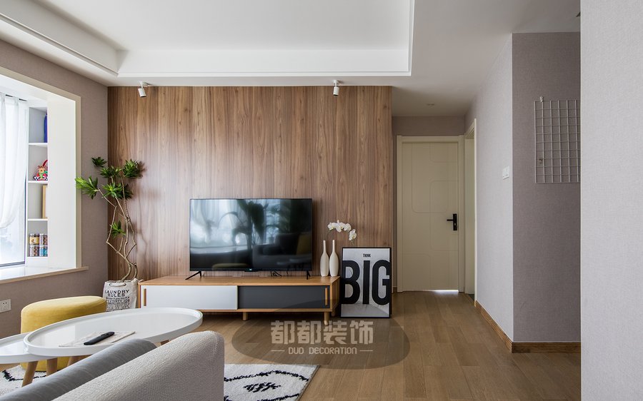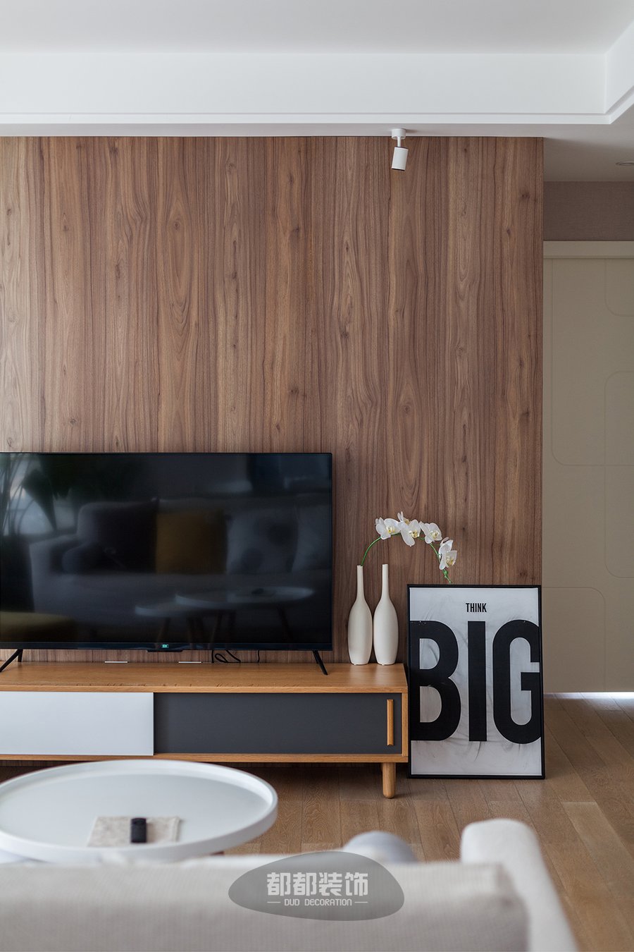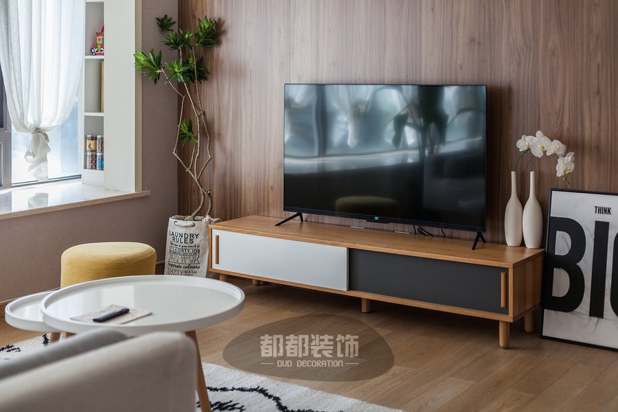 电视背景墙与地板”撞了个衫”,但同样好看,高40cm的黑白拼色电视柜,推拉设计易拉易取。