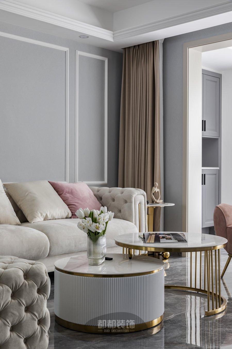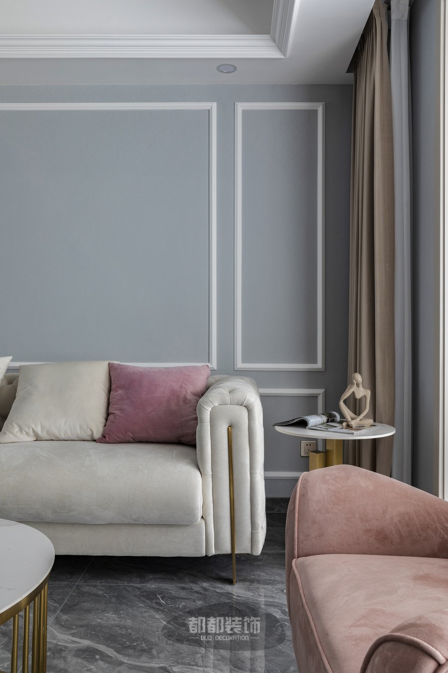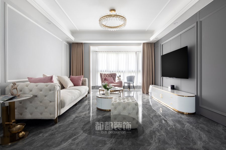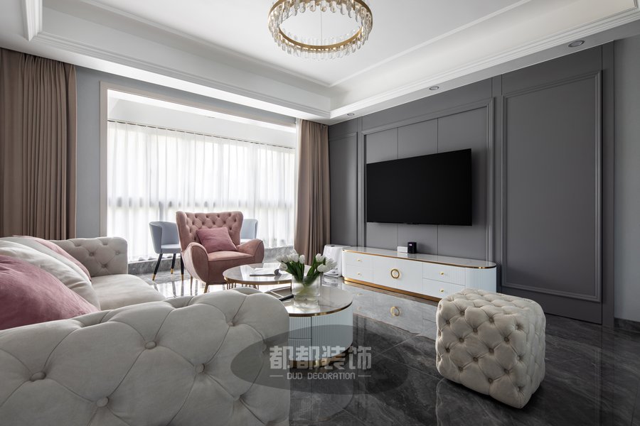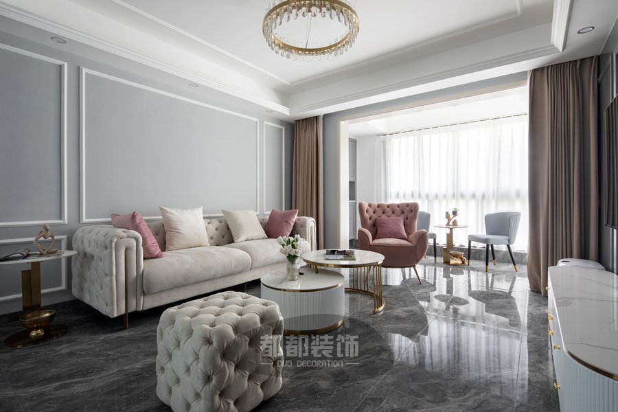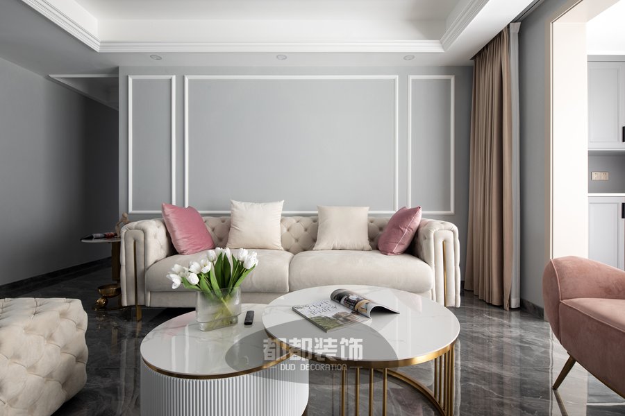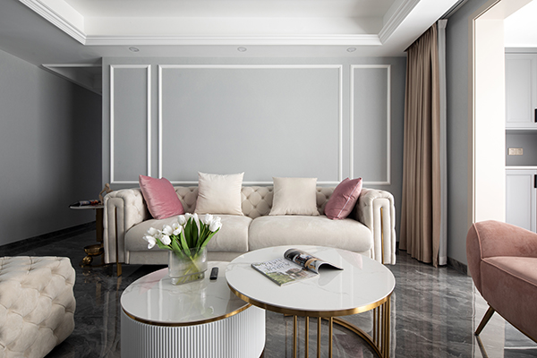 客厅地面通铺了深灰色纹理大理石瓷砖,大面积落地窗搭配上暗橙色窗帘,让室内光线充足,整体色系温馨放松,粉色的软装仿佛散发着美式独有阵阵的幽香。