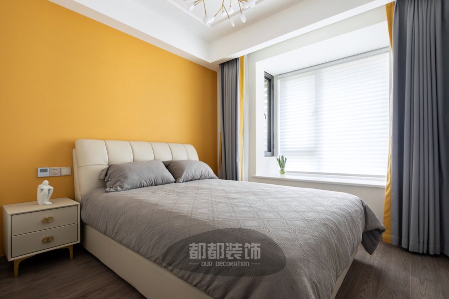奶酪般的柔软床头板替代笨重的实木板,美观又轻巧,百叶窗不仅可以给室内提供的光线,还能进行室内外的通风换气,颜色不同的双层窗帘,递进的层次感,更是让人感觉温婉舒适,整面明亮的黄色与窗帘内衬相呼应,如阳光般带来了一室的温暖。