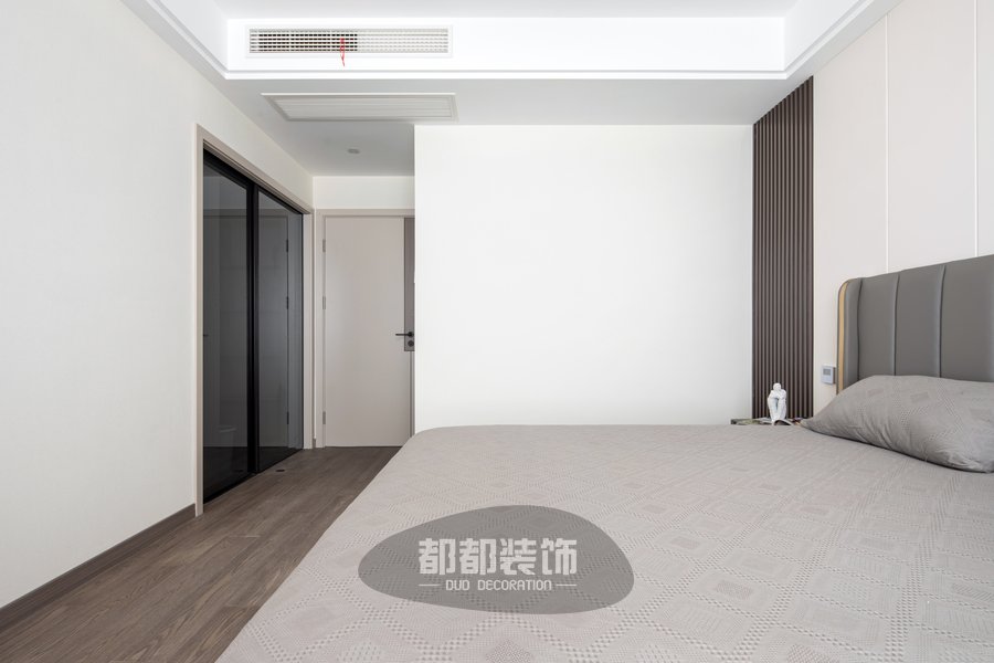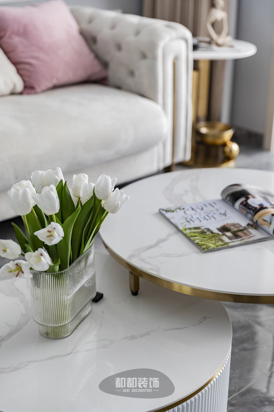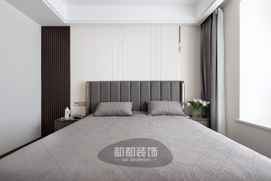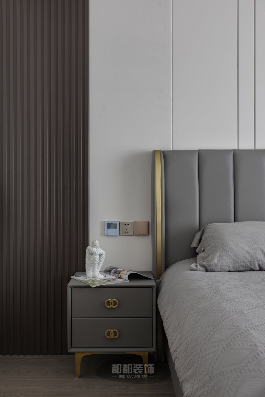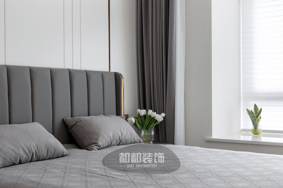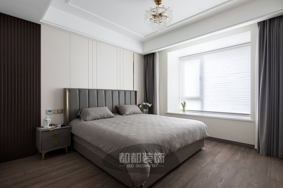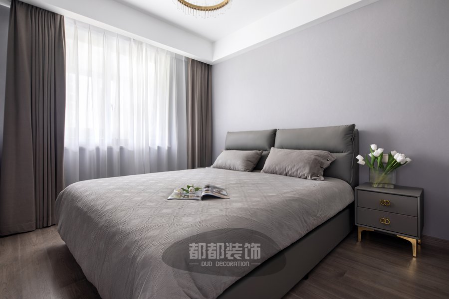 栗色木地板进行了全屋铺设,灰色的墙面给整个空间营造了一种舒适温馨的居住氛围,水晶+金属的圆形主灯让空间洋溢着满满的精致感,床头柜上摆放着的白色郁金香,更是给空间带来丝丝芬芳的味道,这份舒适惬意的休憩时光值得慢慢品味。