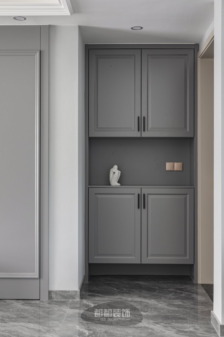 入门处打造一个玄关柜,麻雀虽小,但五脏俱全,集合了全家人鞋子、出门日常用品、等多功能收纳,高级灰的配色让空间开阔不跳脱;镂空区域预留了插座,平时充手机或者后期镶入灯带都会用的到。