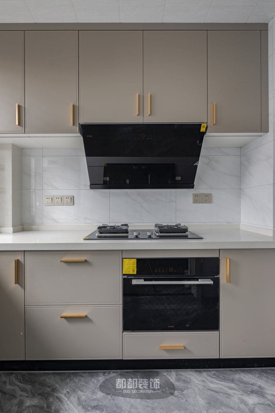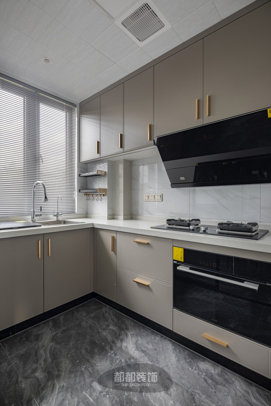 作为赵女士这一类爱做饭不爱打扫的人群来说,橱柜一定不能做成开放格和白色,因为油烟真的不好打理,类似驼色柜门就是绝佳选择,深色纹理地砖加黑色踢脚线,灰白渐变墙砖呈现增添视觉灵动性,白色台面简洁易整理。