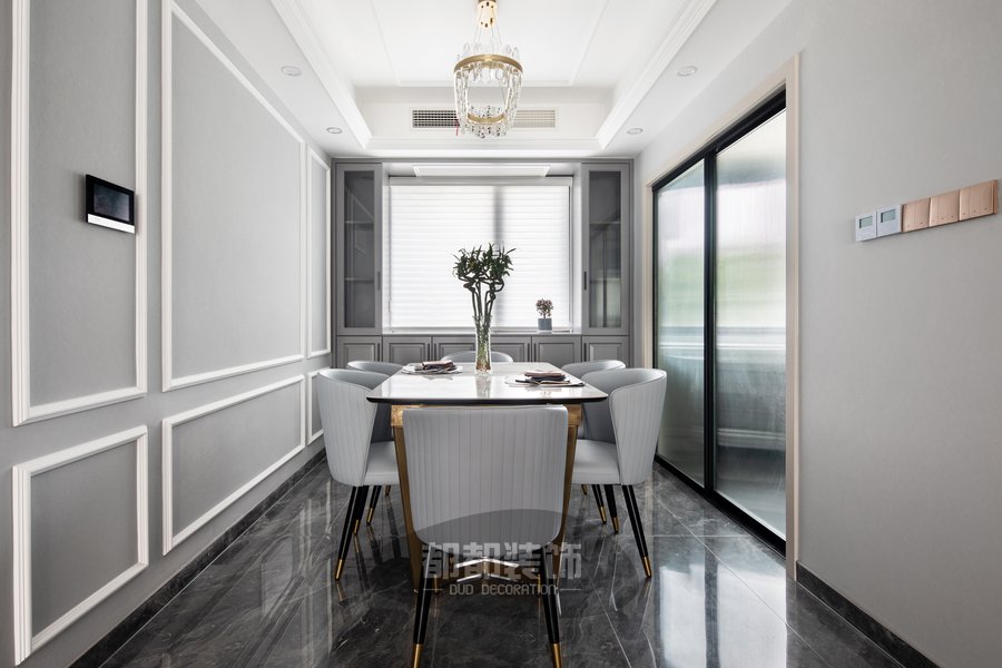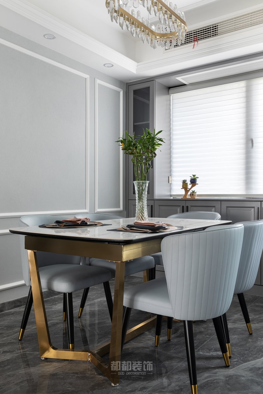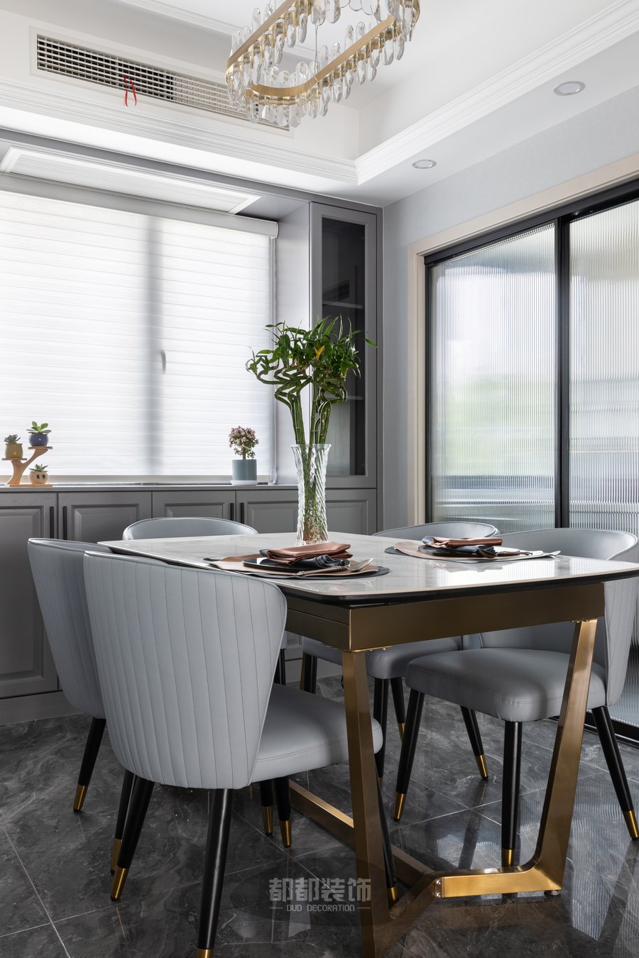 沙发背景墙延伸至餐厅,整体空间更加开阔,岩板餐桌上摆放着整洁的餐布,稍加布置即有生活气,也不失仪式感。