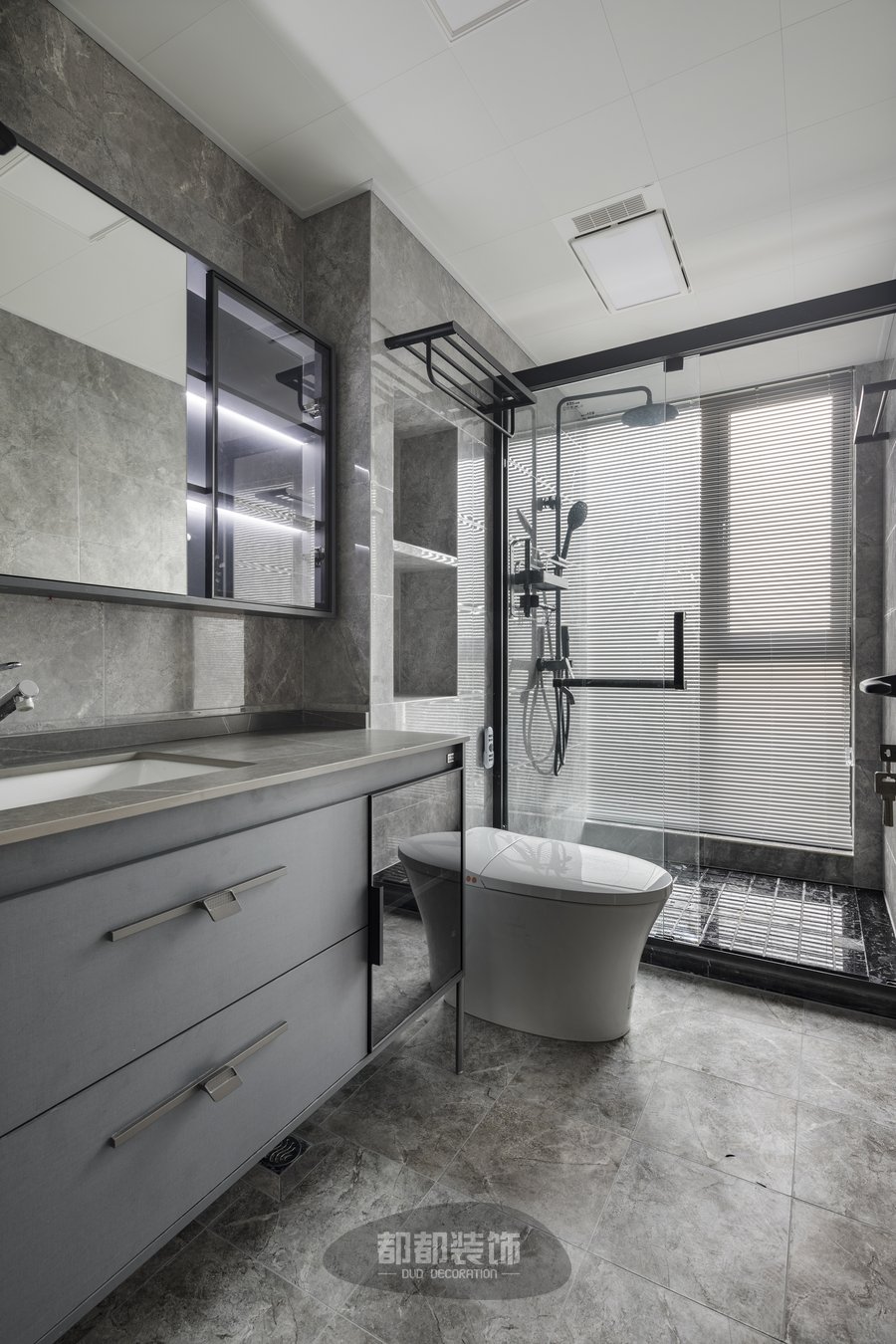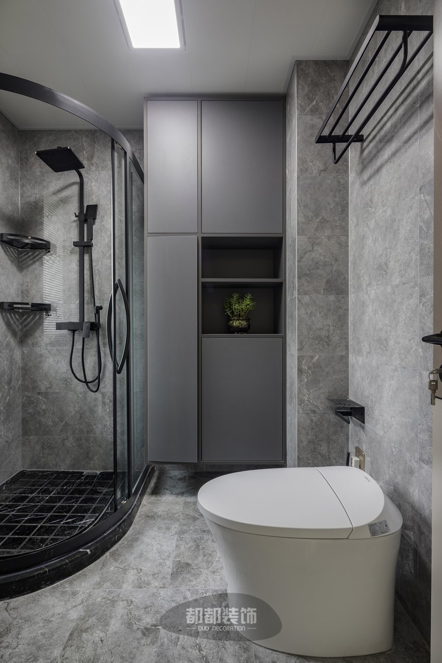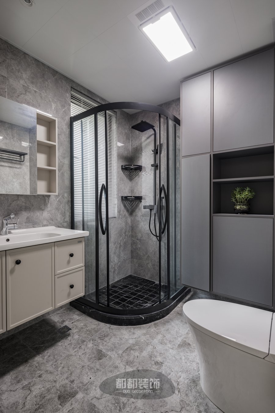 因为外推隔墙而变得空间宽敞的主卫,在卫生间里设置了一个独立淋浴间,等晚上下班时便可以在这里冲个舒适的澡,以此来缓解一天的疲惫,在墙面上也设置了置物板,便于放置一些毛巾、浴球等小物件。