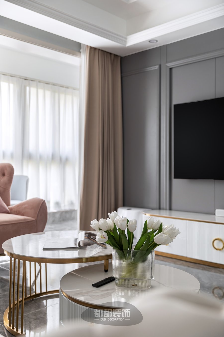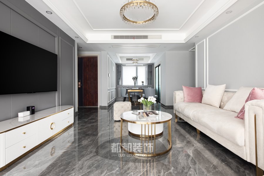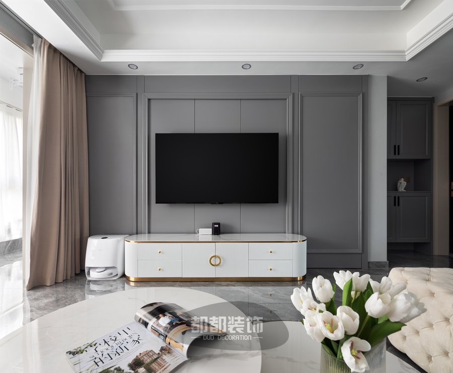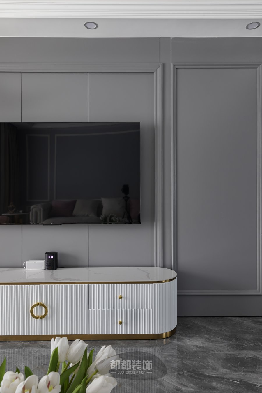 电视背景墙采用灰色线板勾勒,整个立体空间更加有层次感, 电视下方的白色的岩板浮雕电视柜,落地矮脚设计配以光亮的五金,酷中又带着温馨格调。.