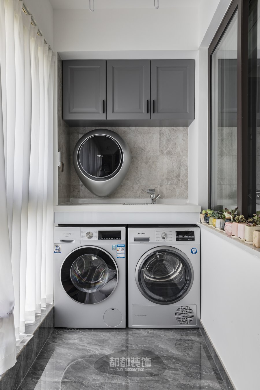 阳台处的储物柜采用了同款玄关柜,但是容量升级,阳台不仅可以作为洗衣晾晒的地方,也是休闲的好地带,摆上一套桌椅家具,在夏日慵懒的假日,跟着随性的音乐,再来一点下午茶和甜点,在半包围的椅子里,品味美食,相谈甚欢。