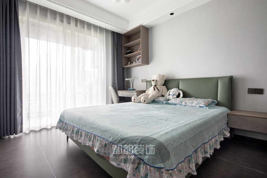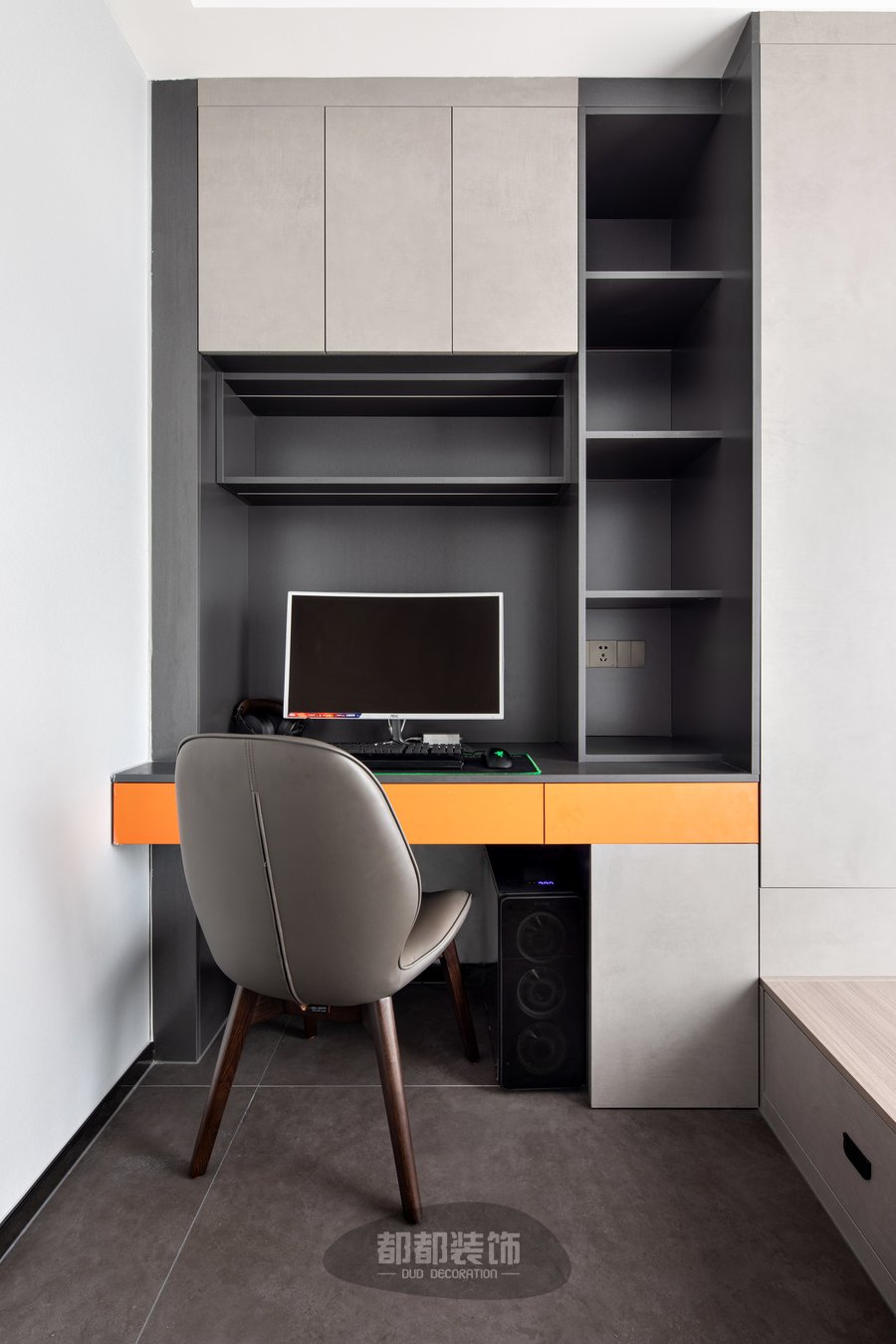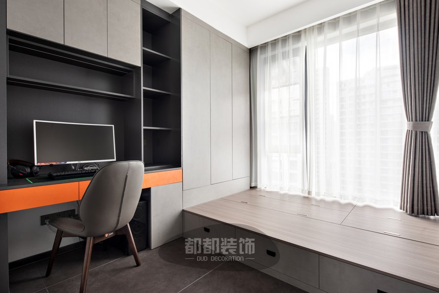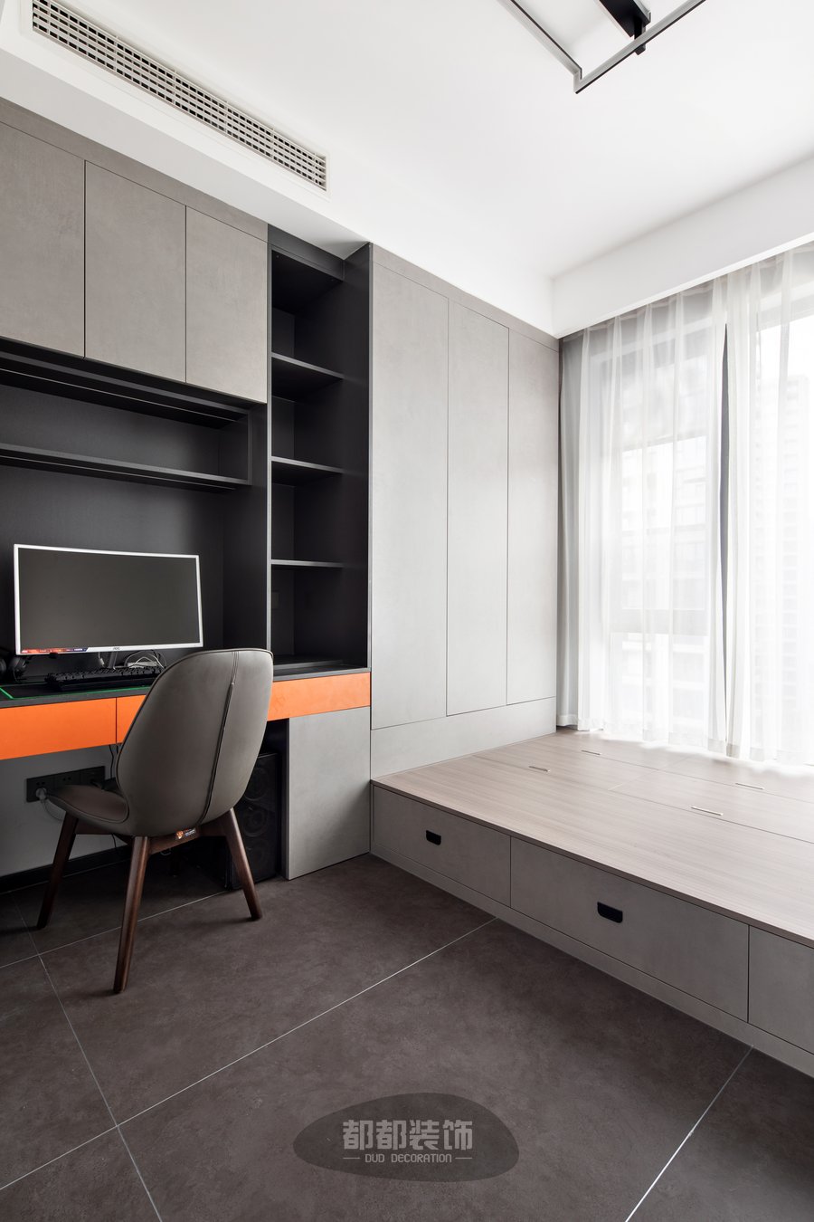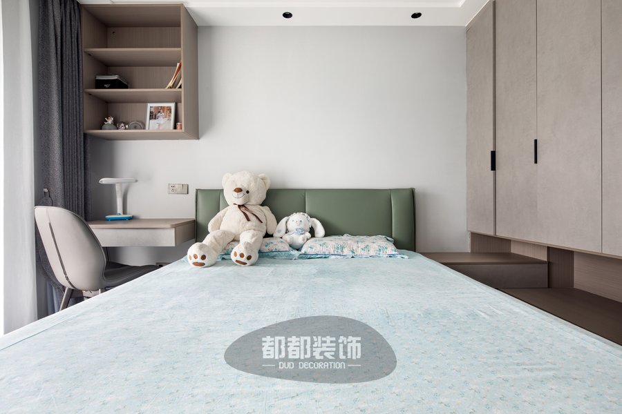 床底柜+到顶衣柜+书桌吊柜完全包揽了整个房间的收纳功能,最大化的便捷了空间的使用感及提升生活的品质感。