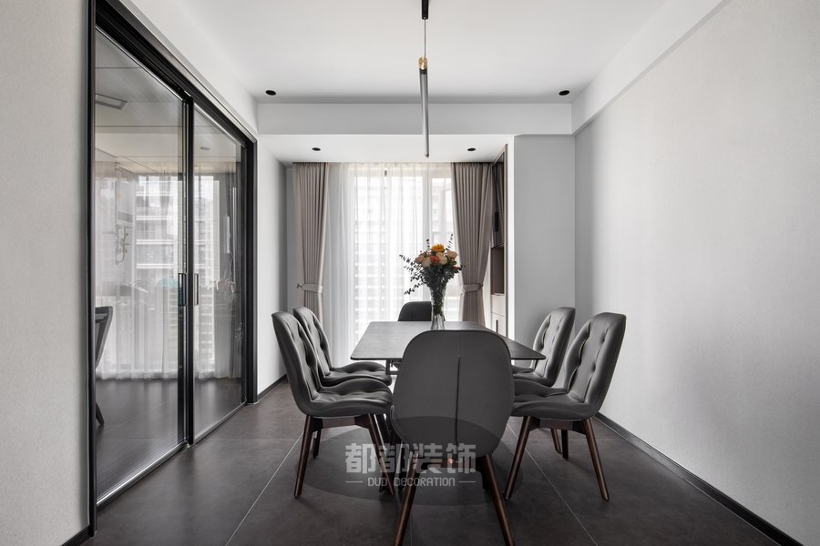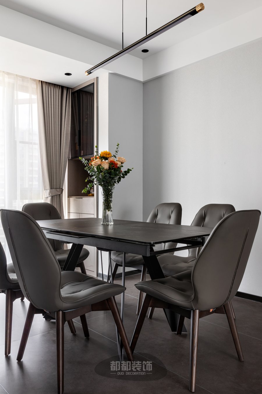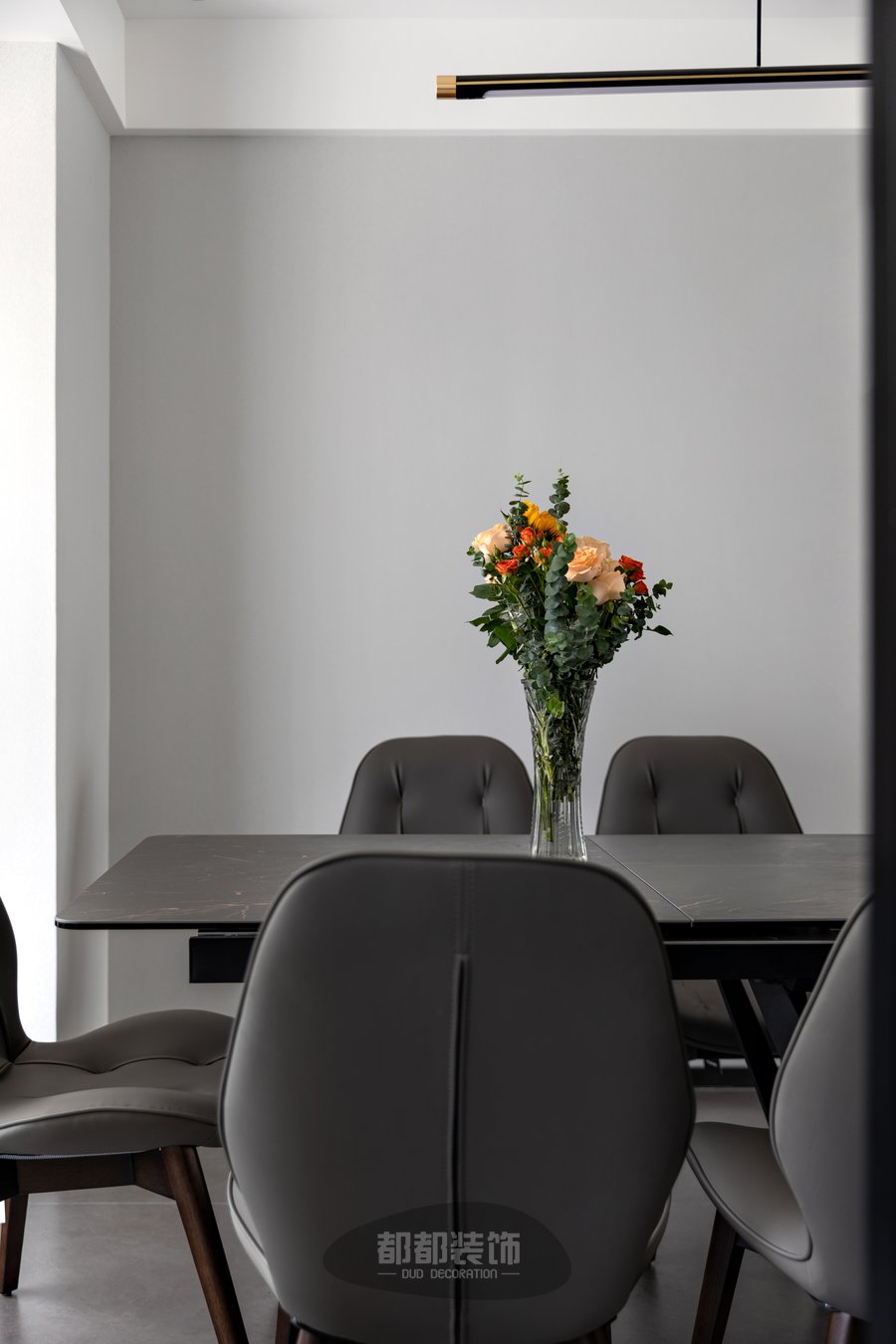 餐厅用开放式的设计把采光和互动性融合,打造全新的用餐聚集地;低饱和度的灰色软包餐椅搭配实木桌面,除了营造现代中的轻奢感,更自带优雅、稳重的特性,色彩缤纷的花束是打破沉闷气氛的小能手,也增加了空间自然的舒适感。
