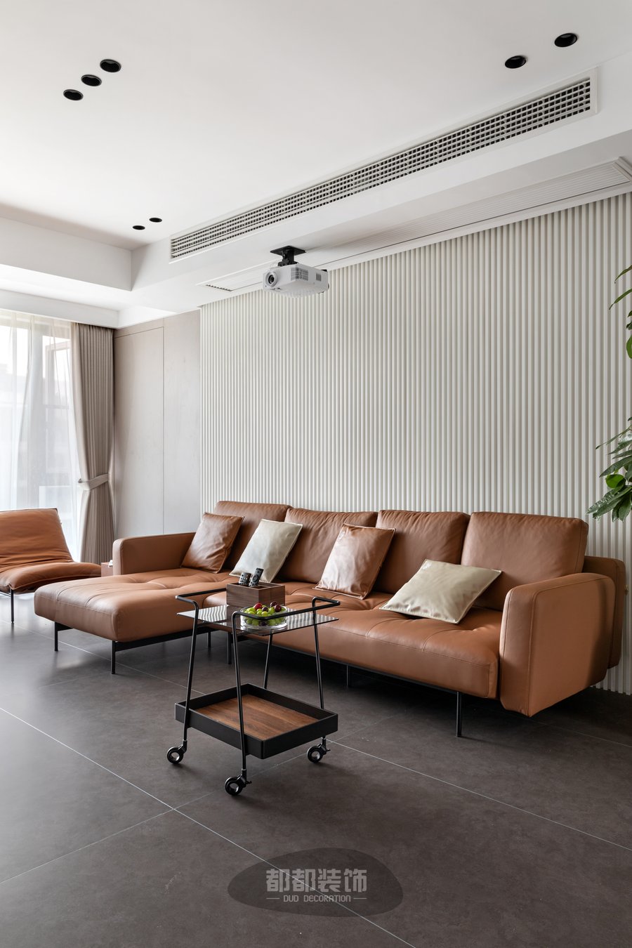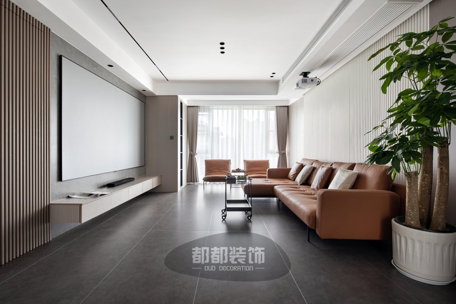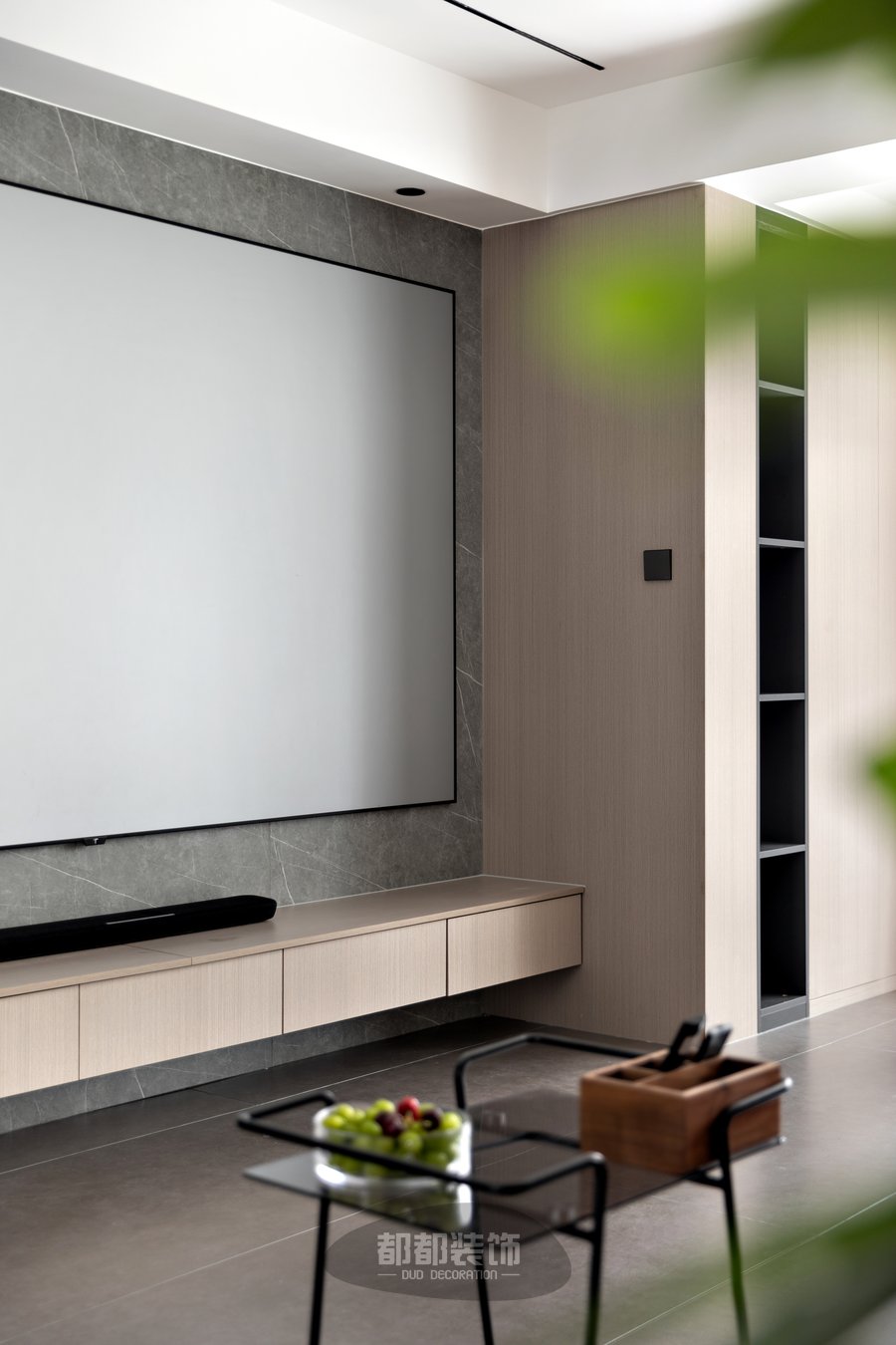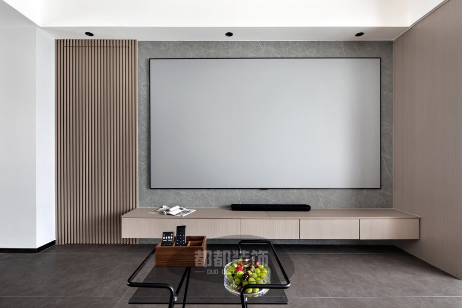 投影背景墙较为简洁,浅灰色铺底有放大视觉的效果,搭配白色的投影布也不突兀,为了增加看点,局部一侧增加奶茶色木格栅,带来恰到好处的层次、色彩变化,从侧面烘托出慵懒的氛围。