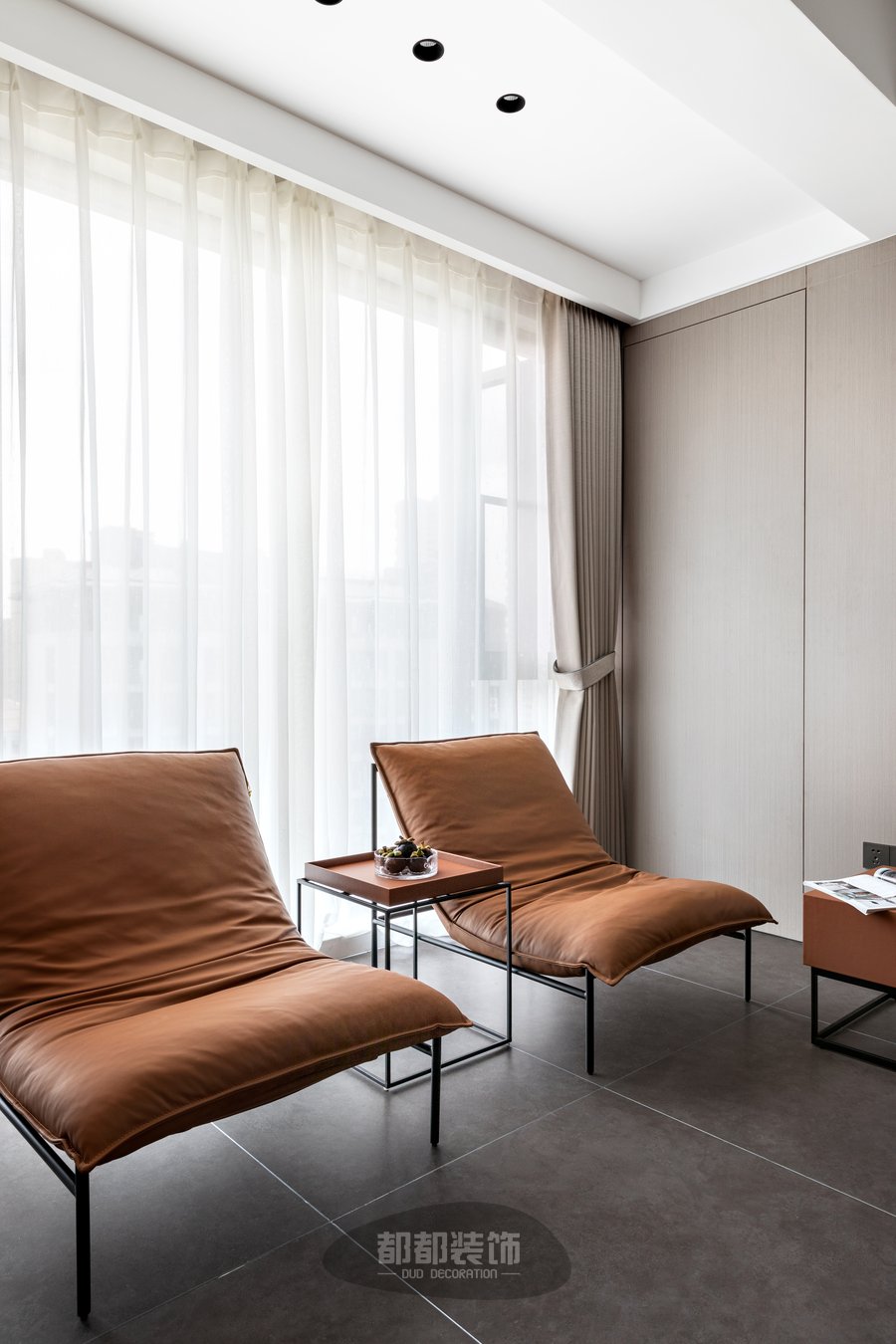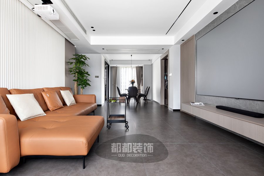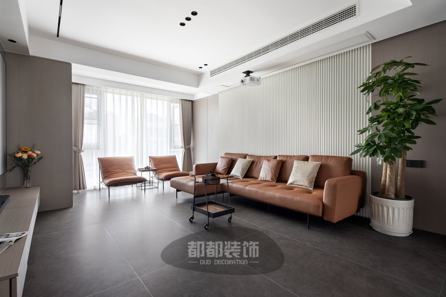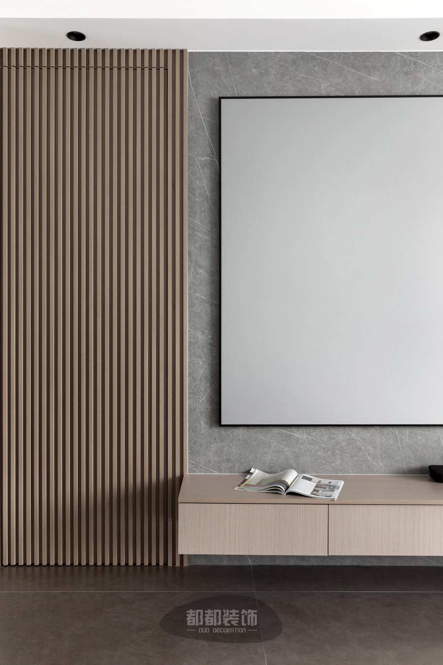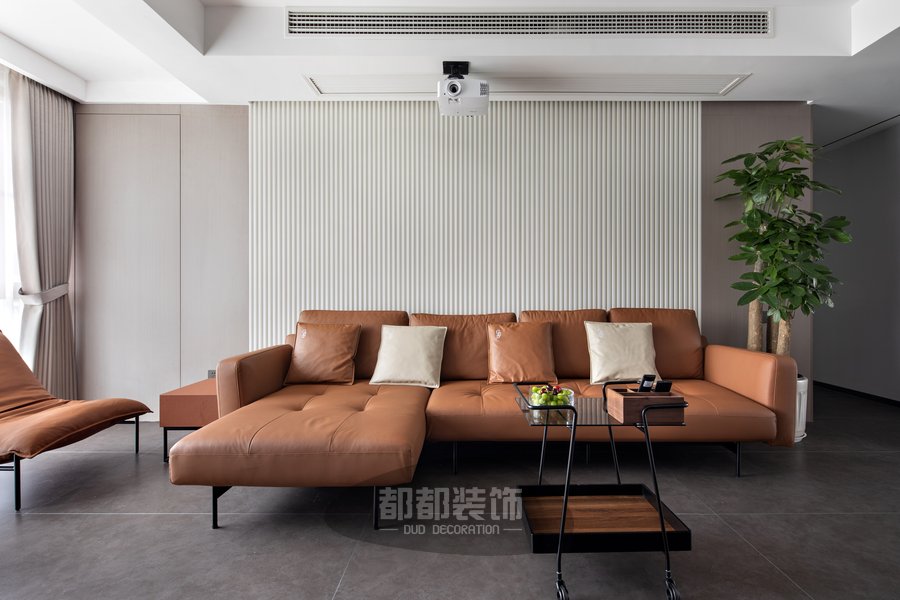 投影背景墙较为简洁,浅灰色铺底有放大视觉的效果,搭配白色的投影布也不突兀,为了增加看点,局部一侧增加奶茶色木格栅,带来恰到好处的层次、色彩变化,从侧面烘托出慵懒的氛围。