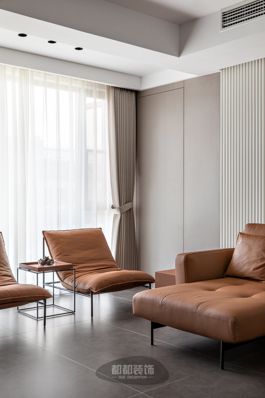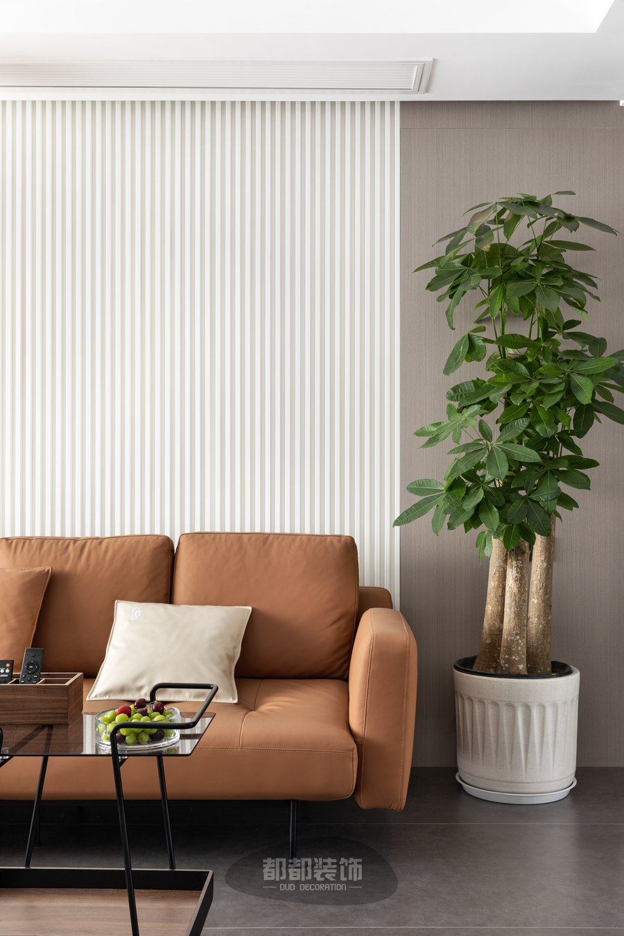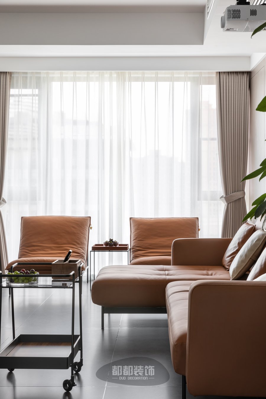 亮棕皮质沙发是客厅综合暖调的基地,在乳白的背景墙下显得格外灵动,双层可移动茶几高低错落摆放增加感的同时,实用加分。