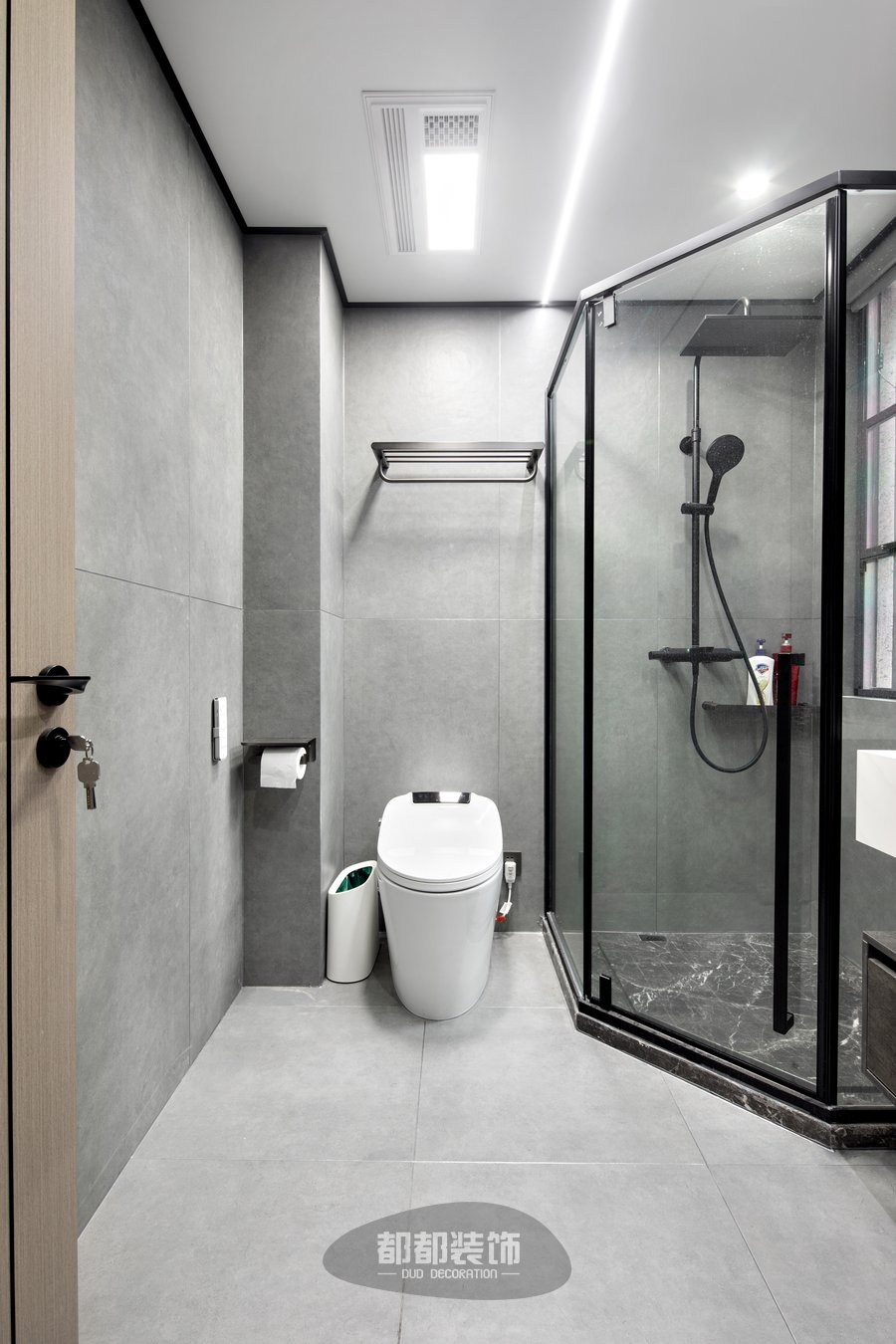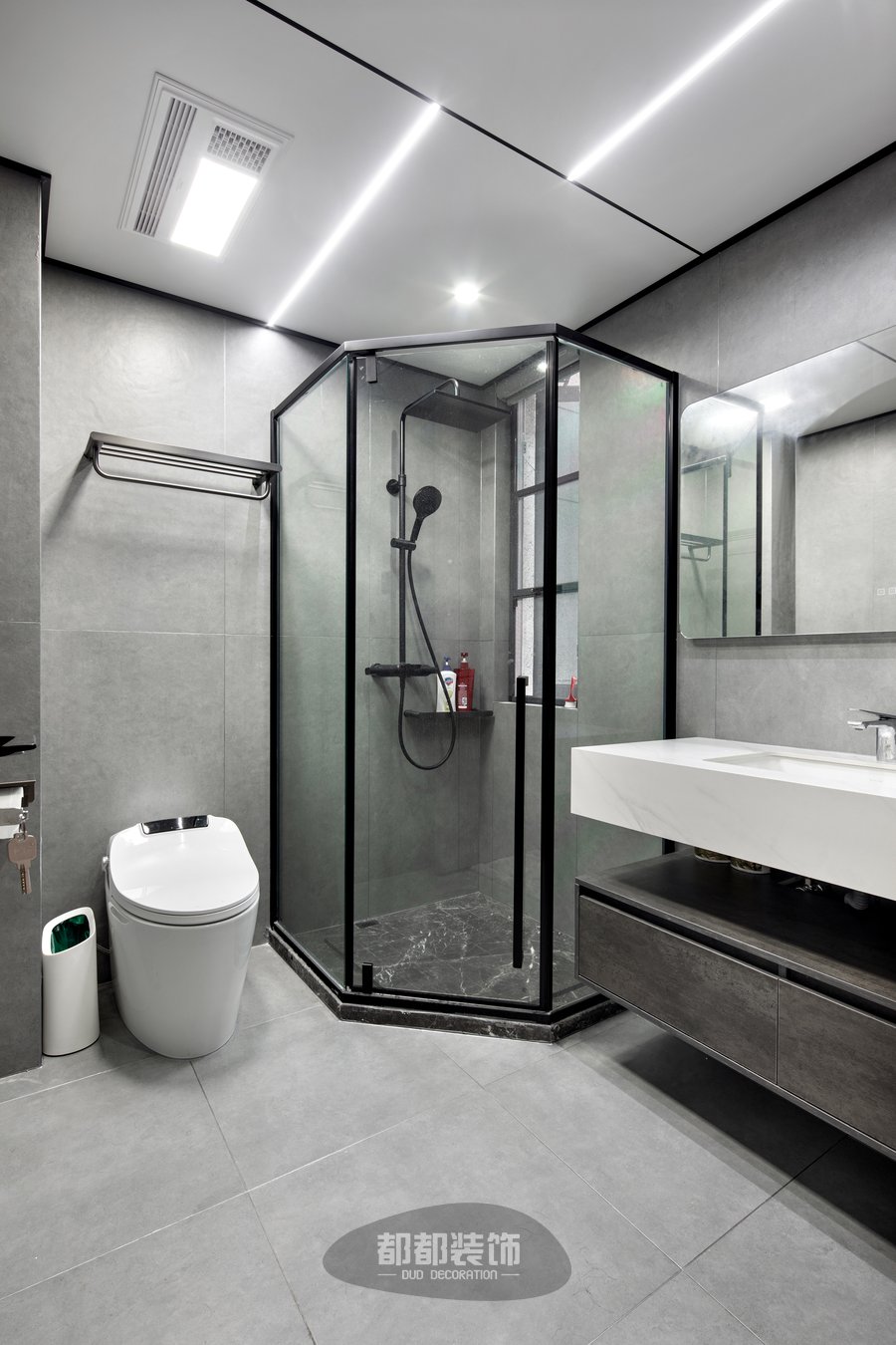 卫浴空间整体以保证功能使用为主,浅灰的优雅,石材的质感,金属的时尚,共同烘托出典雅舒压的氛围。