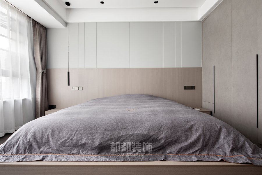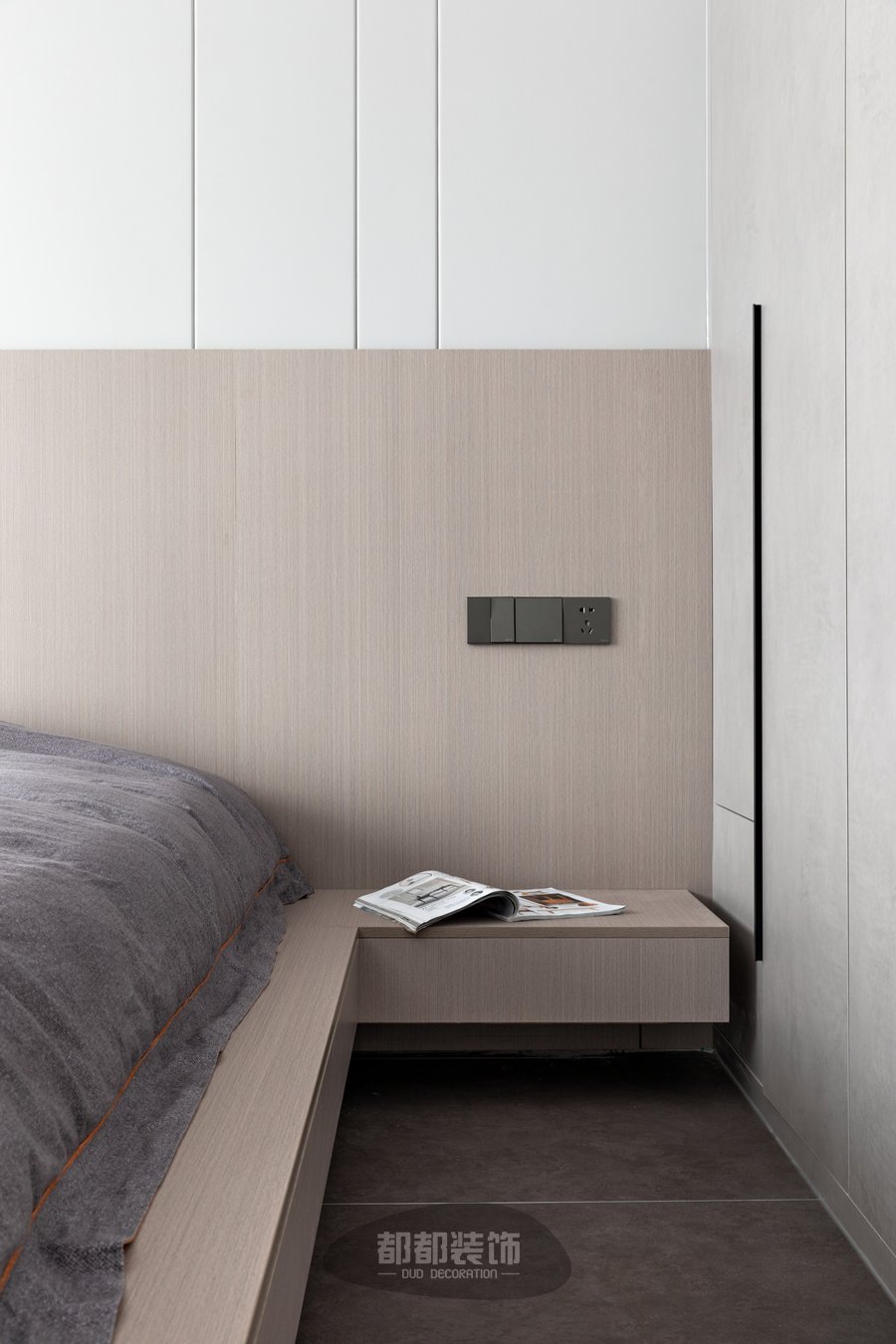 榻榻米延伸出床头柜,结构线条干净利落,柜体悬空的设计高级感十足,圆柱形吊灯让光线近距离的照亮每一个角落。