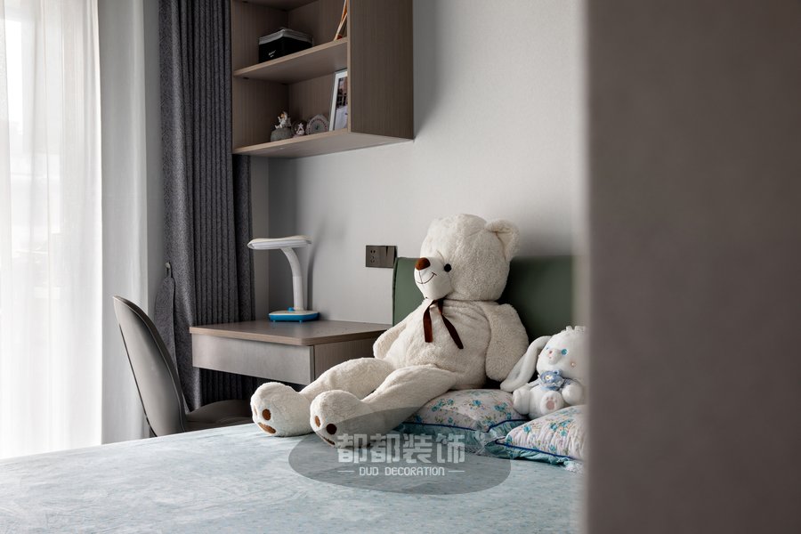 桌面太小、东西太多怎么办?一个开放式吊柜就能解决你的烦恼,相册、书籍、文具等常用的东西都可以放在吊柜上,竖向比平放真的省了好多空间,希望小女儿能在这个温馨的房间里收获童真的欢笑和亲密的陪伴!