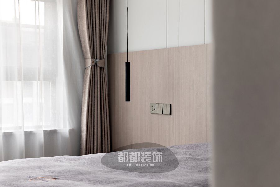 主卧整体是摩卡的慵懒色调,奶白色+原木色拼接背景墙搭配着浅灰色床品,编织着自然与宁静的梦,诠释着最理想的港湾。