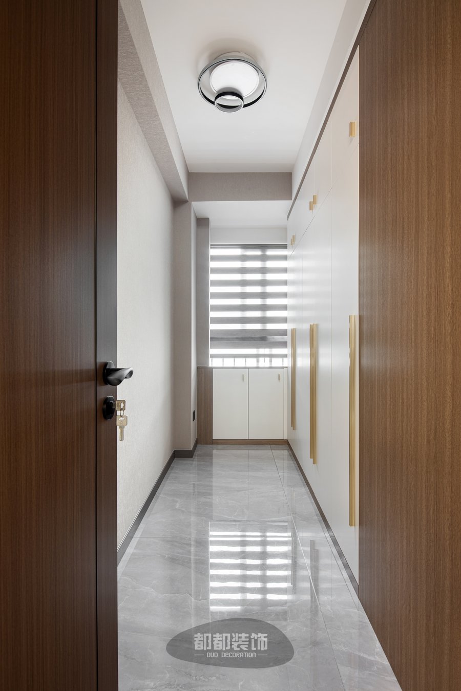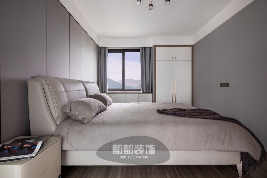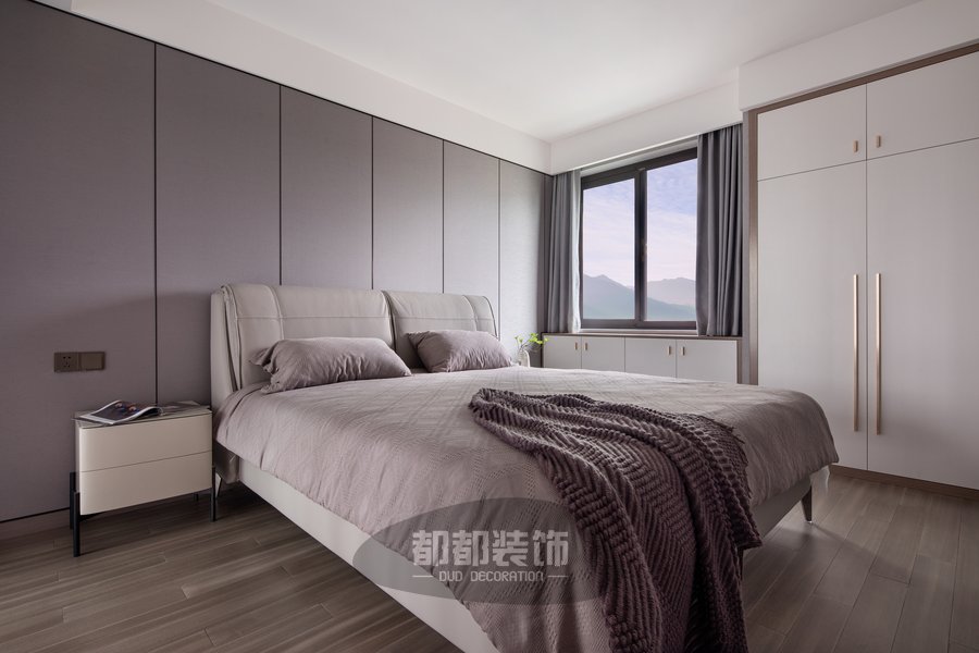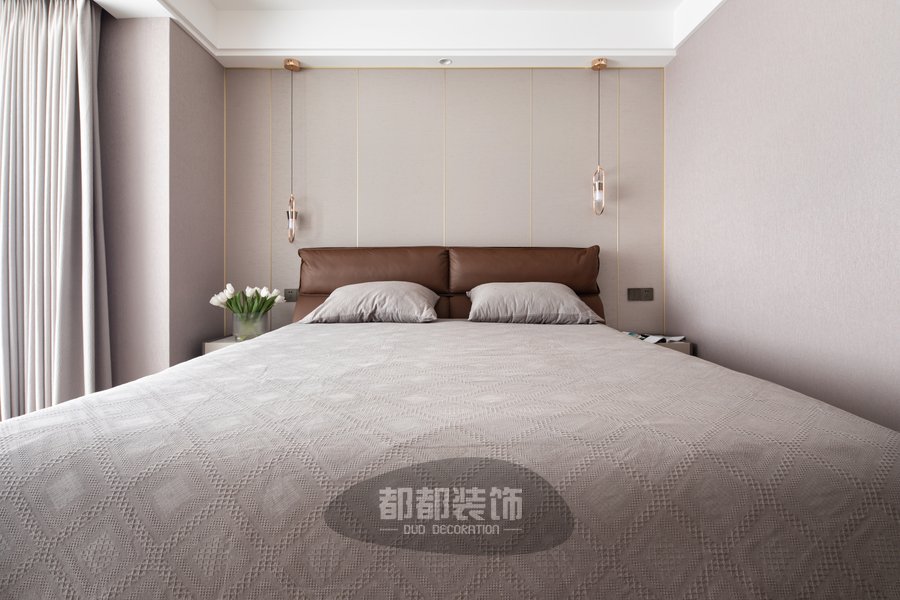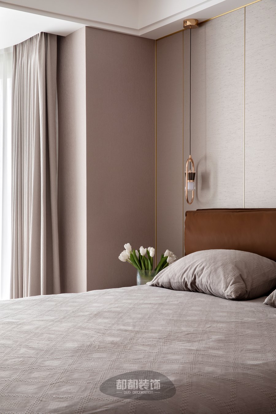 定制与窗台齐平的矮柜可以帮忙分担双开衣柜的收纳不足问题,无主灯设计在空间上拉升空间层高,让人在都市里放慢节奏,静静享受归家的喜悦。