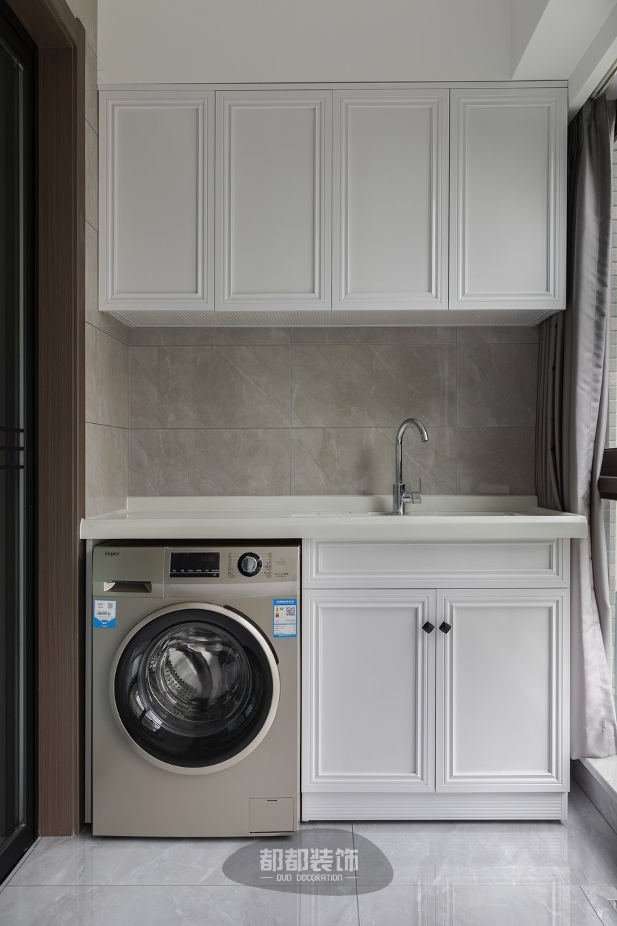 阳台的吊柜也是储物遮丑的好空间,平时不常用的工具统统都可以放在这里,白色线条浮雕让纯色柜体不再单调,给人极度的舒适。