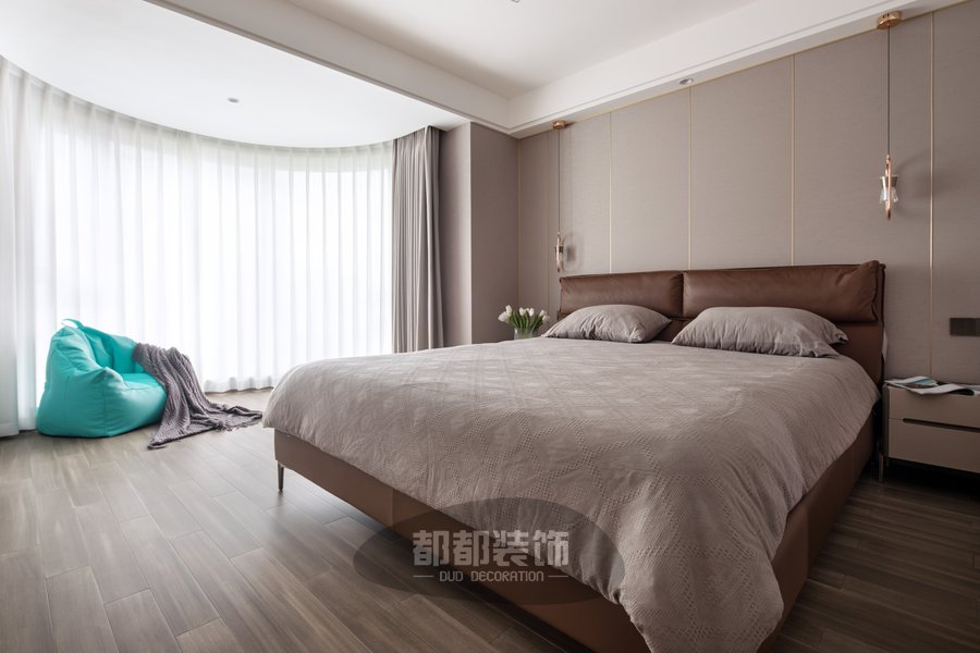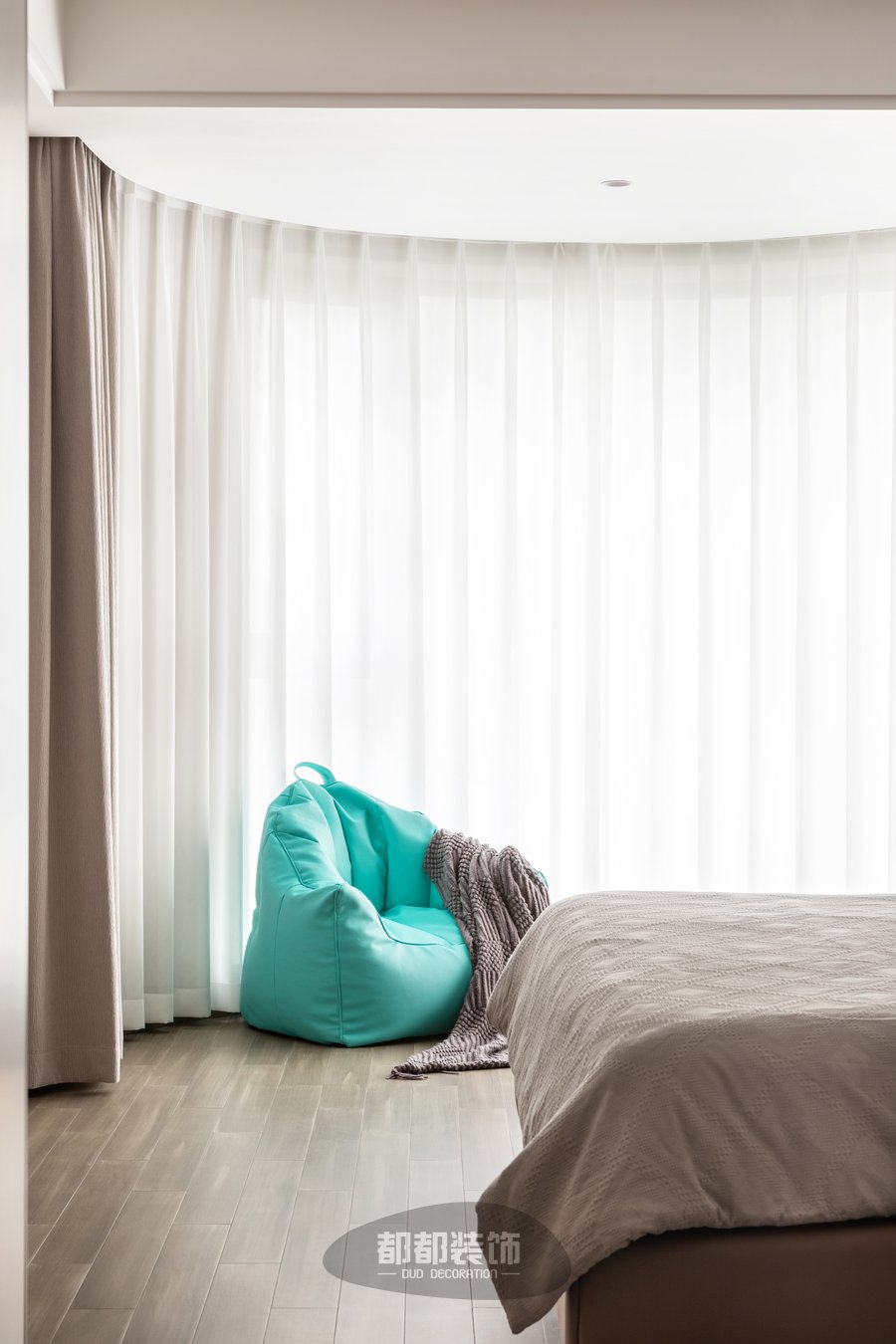 横梁将主卧分为休憩区和休闲区两块地方,半圆形的落地窗将整屋的采光无限放大,荧光绿的懒人沙发慵懒又可爱。