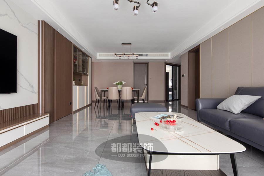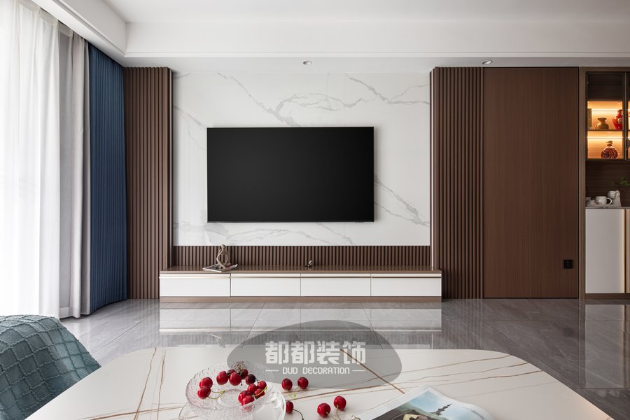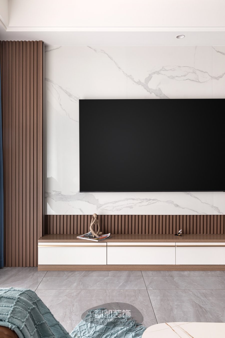 电视背景墙与茶几桌面相呼应,体现出空间的连通与和谐,搭以立体木格栅让空间透露出一丝安宁,无拉手电视柜简洁平整和空间非常搭!