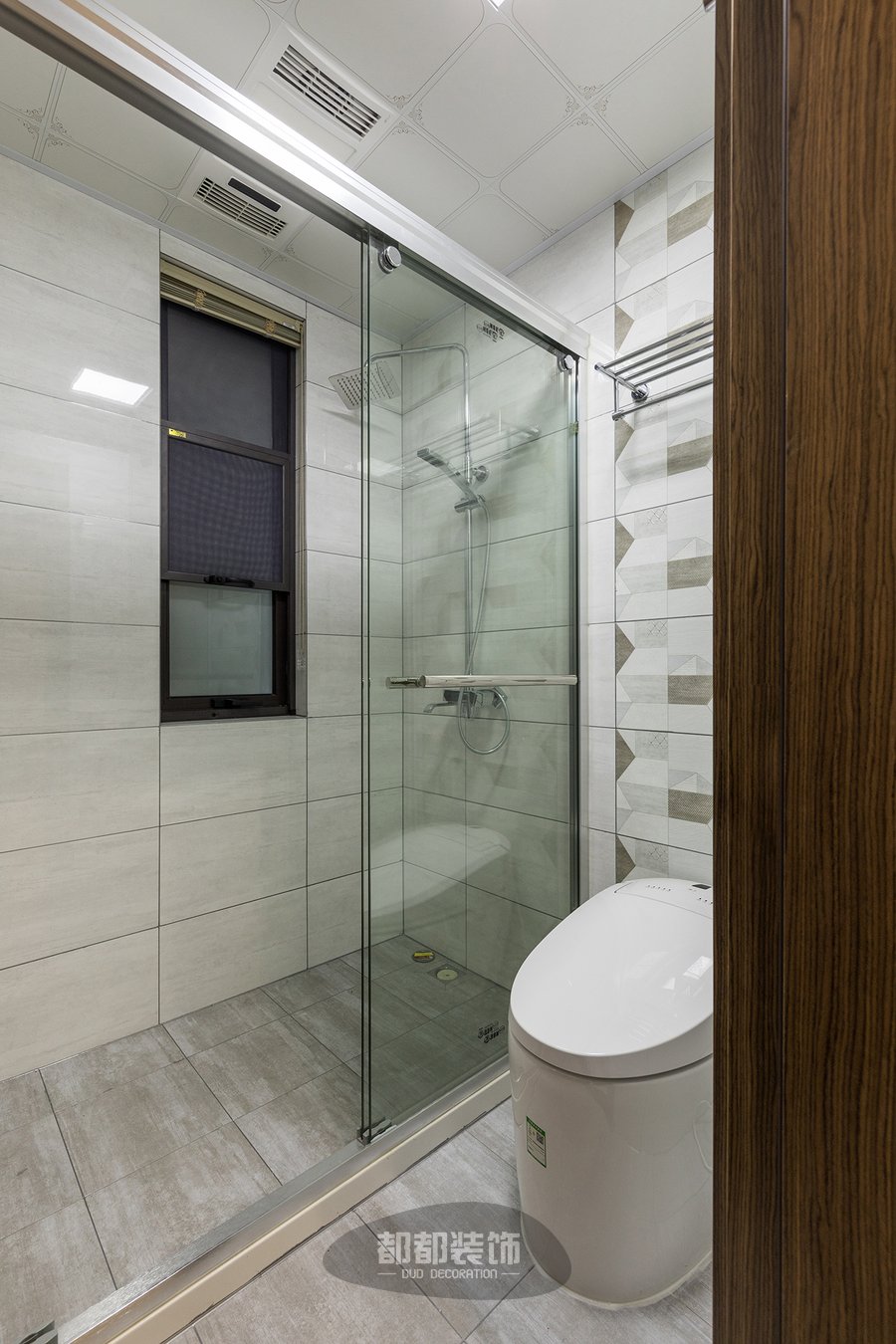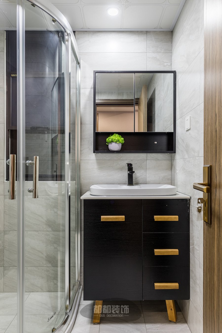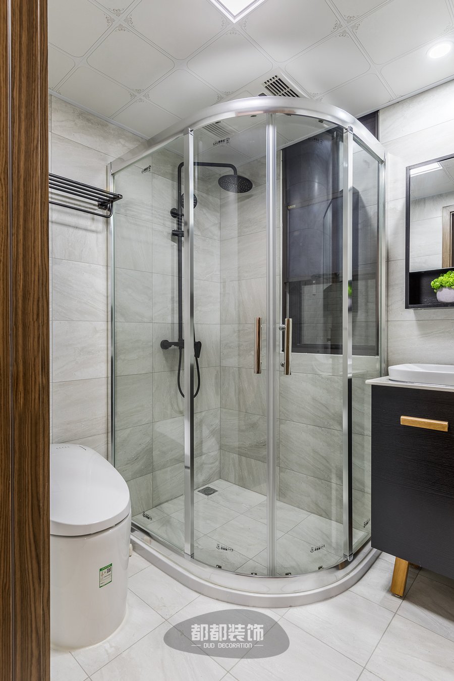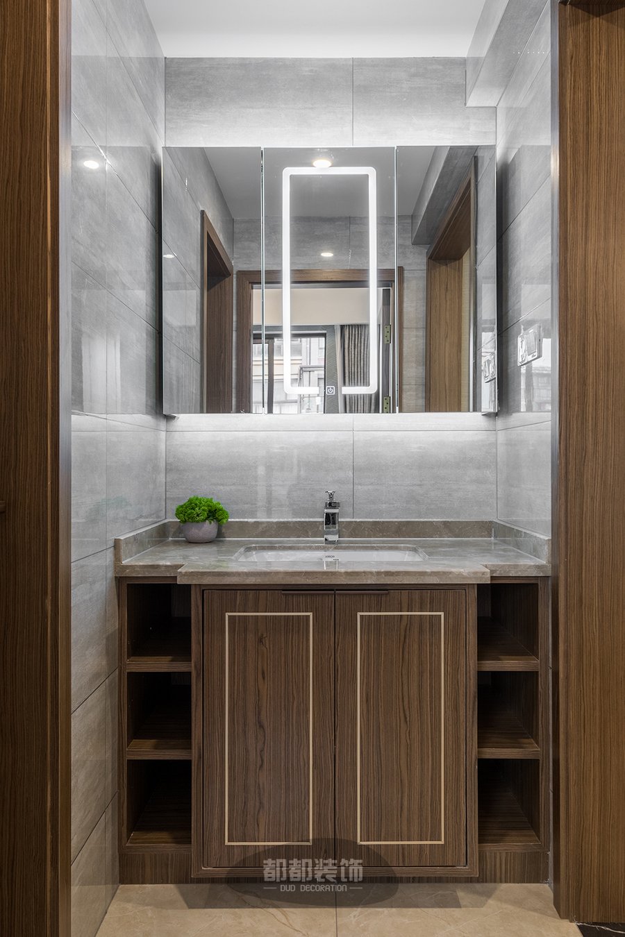 主卫的深思熟虑在于深浅比例的把控以及产品的配置,独立淋浴间和马桶间显示了其顶级配置的标准。纹理细腻的石材极富艺术的表现力,犹如动态的山水画,纵横交织的黑线美缝勾勒出抽象的概念和意境,镜柜中加入线性灯,时尚大气。