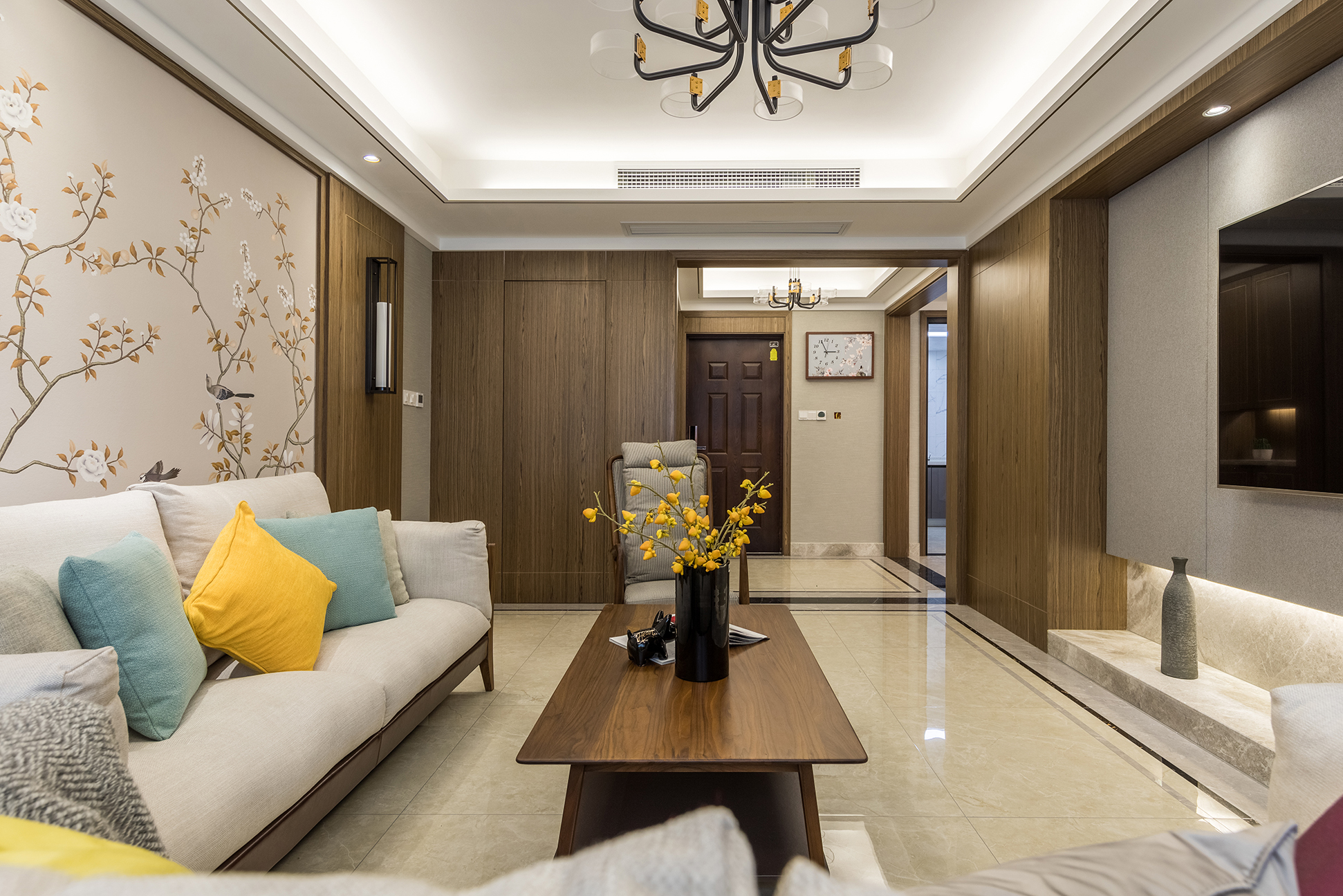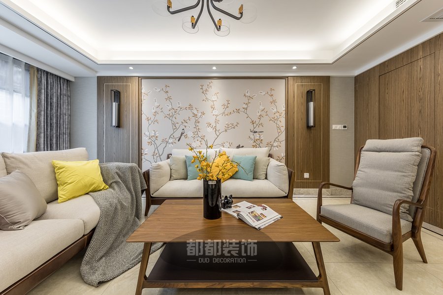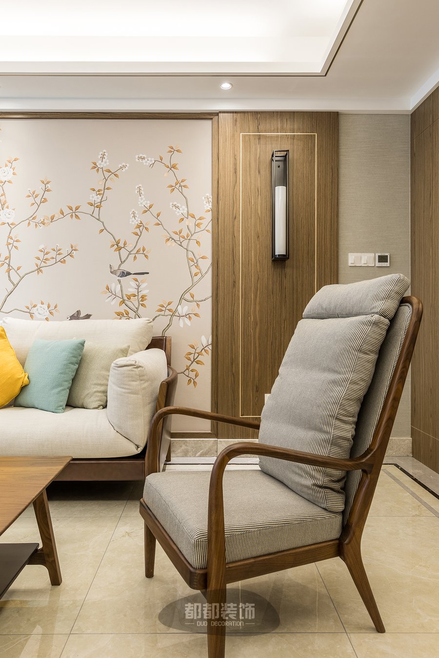 沙发墙是清新质朴的花鸟画搭配原木柜子,仿若在欣赏一副庞大的画卷一般,古色古香。