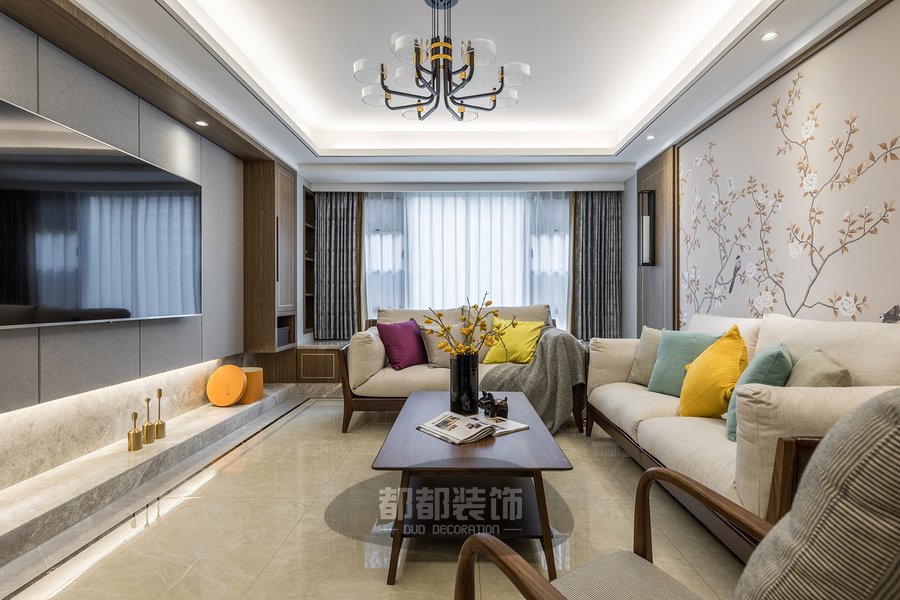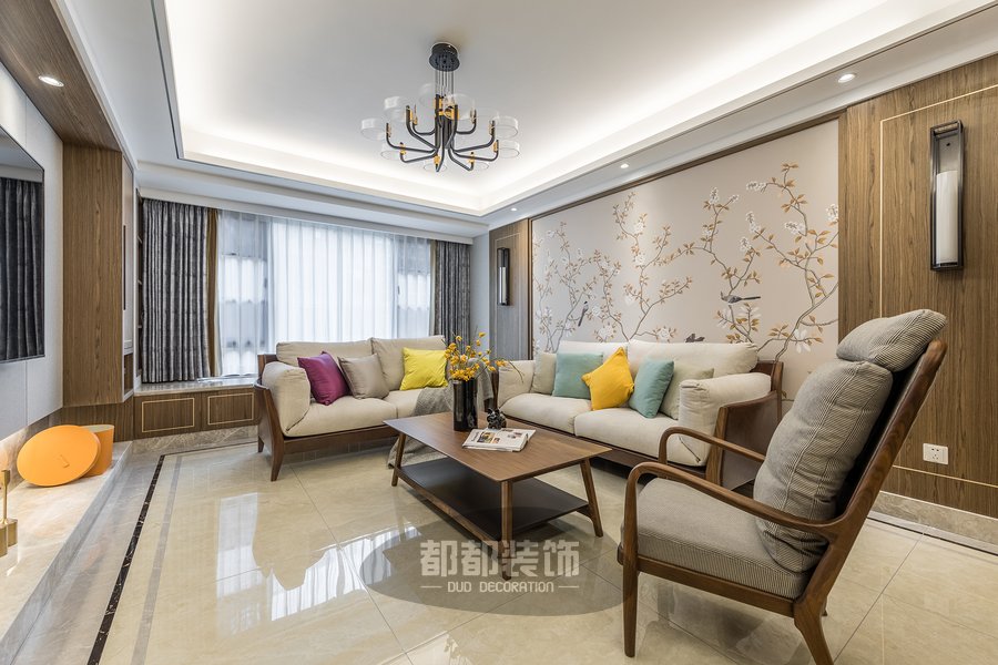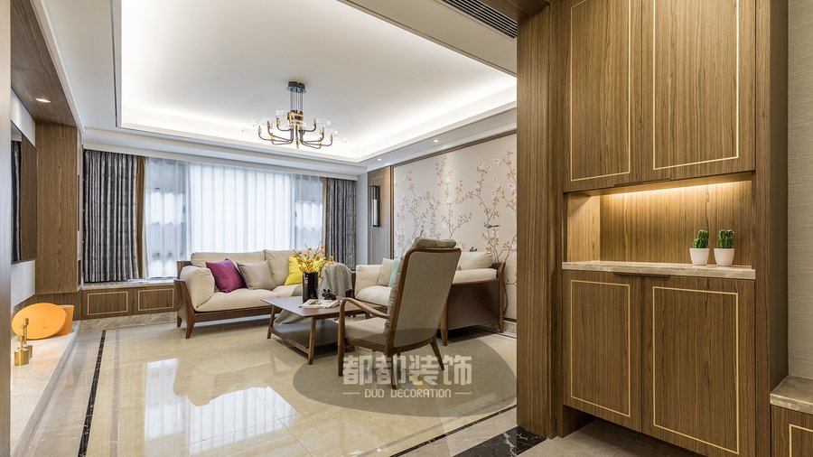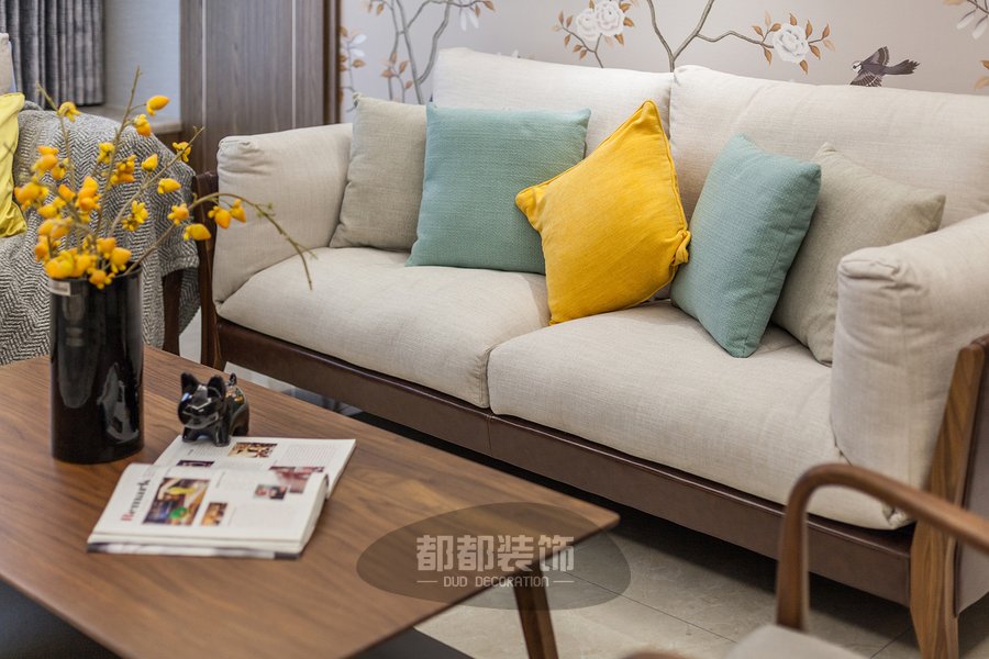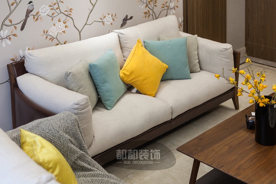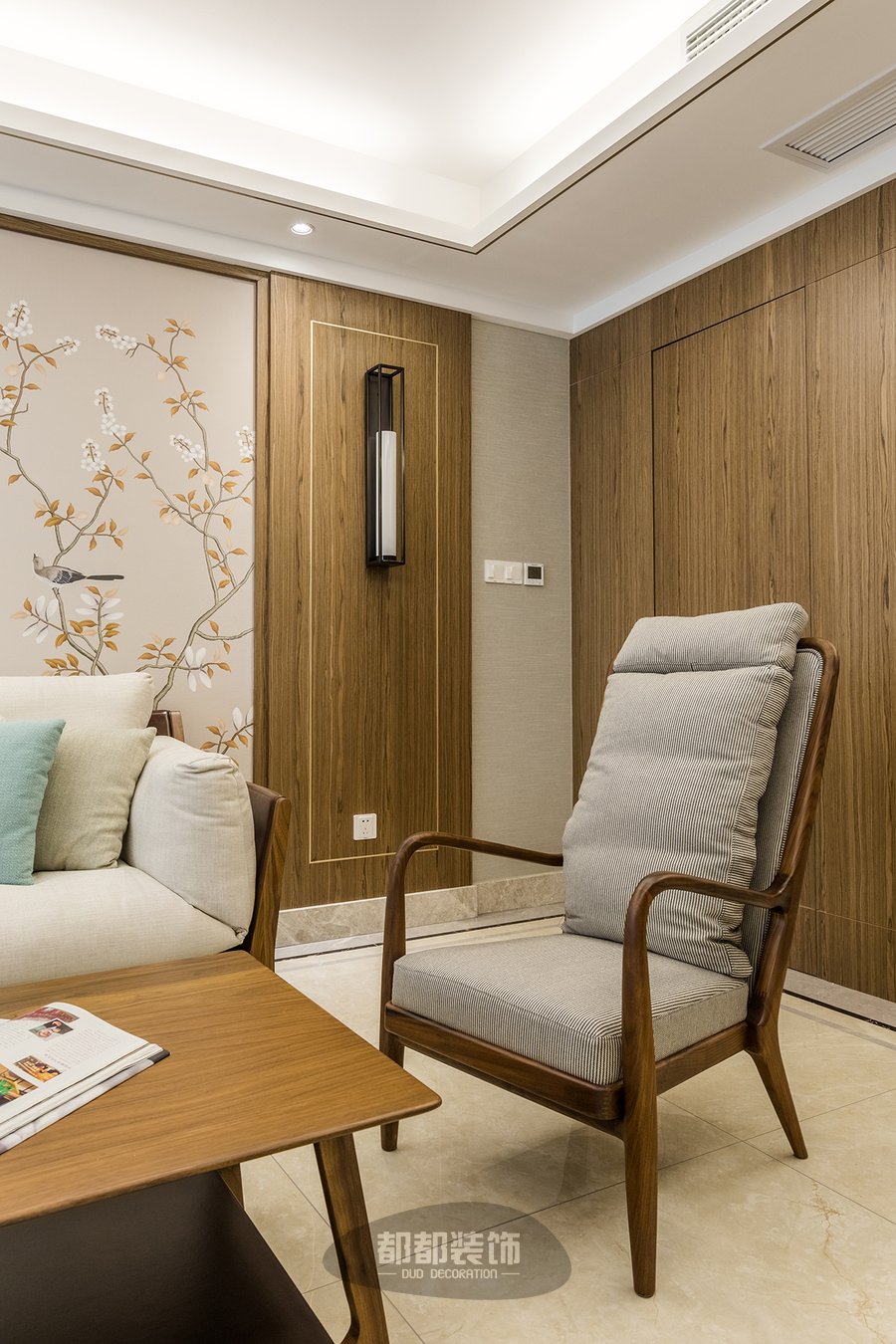 沙发墙是清新质朴的花鸟画搭配原木柜子,仿若在欣赏一副庞大的画卷一般,古色古香。