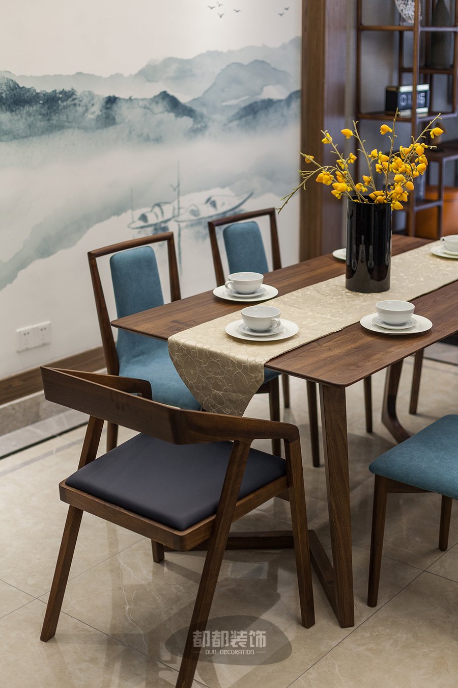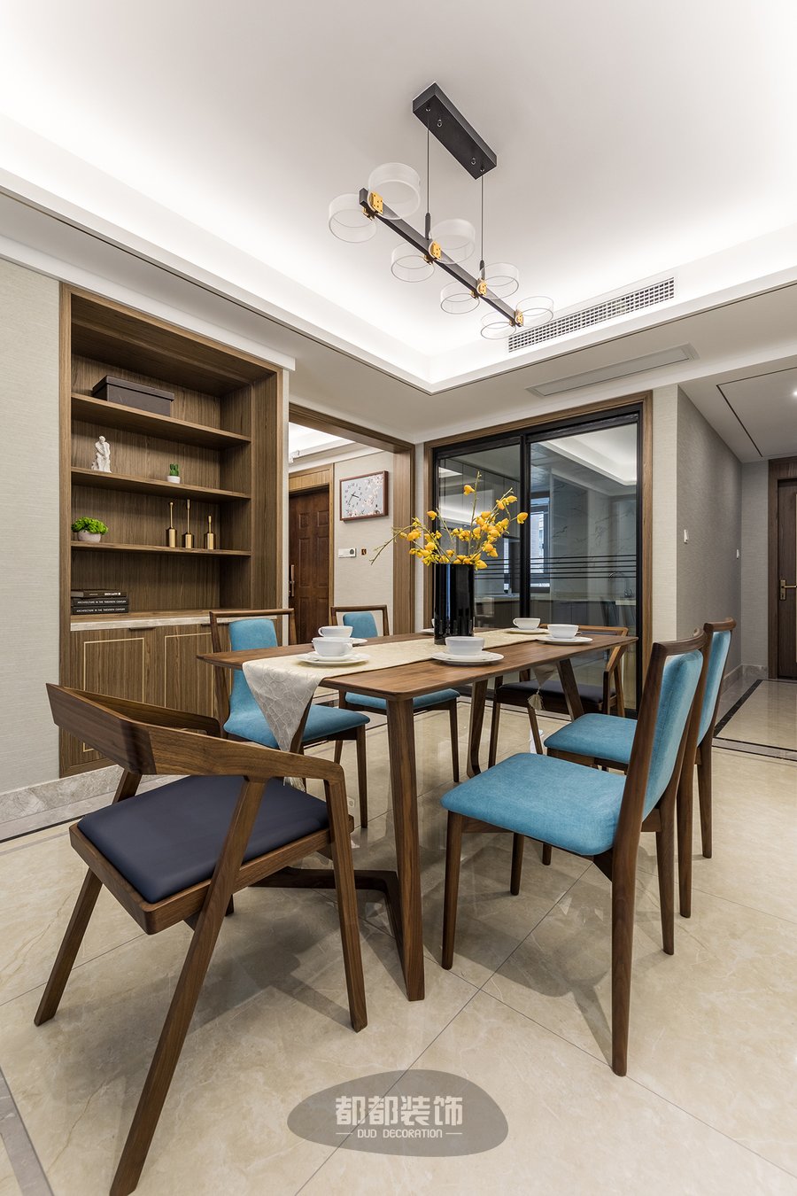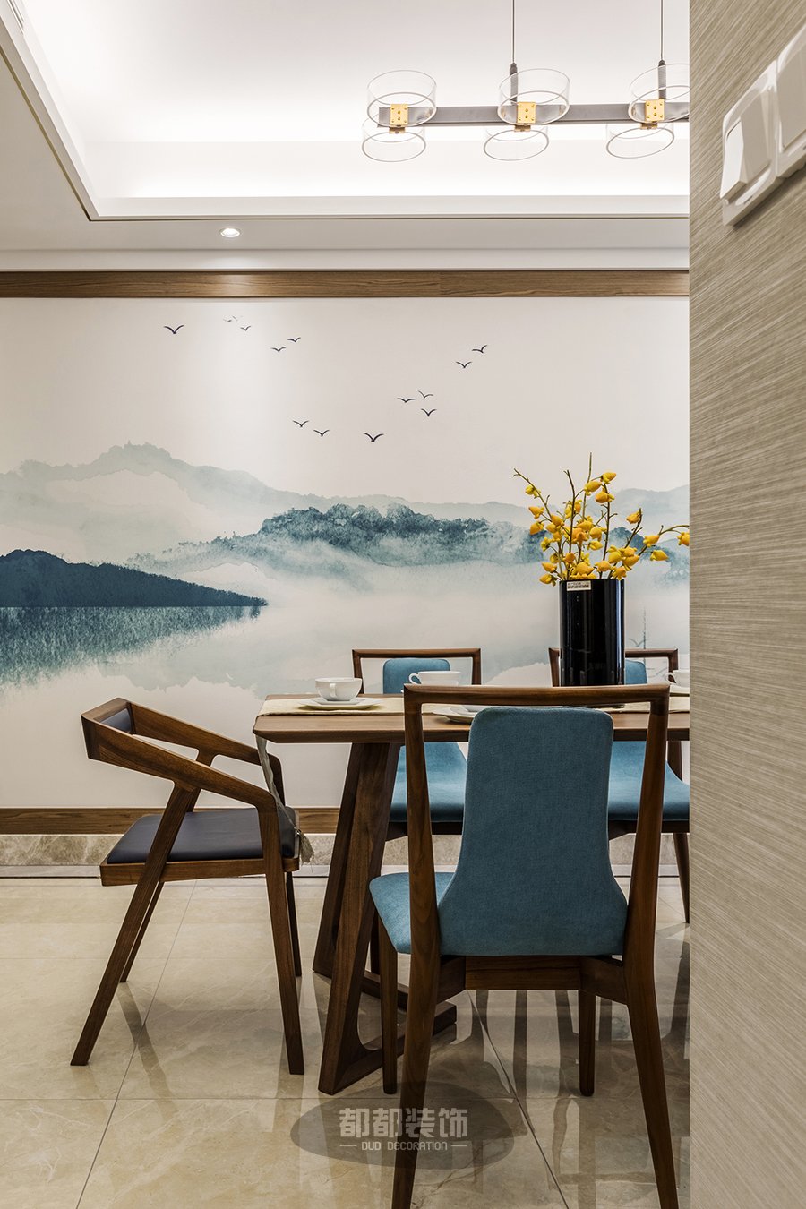 清一色的橡木元素属实有些单调,于是设计师在餐椅和背景墙上面花费了很多心思,选用了清新脱俗的黛蓝色作为点缀色,很符合中式的典雅之美。
