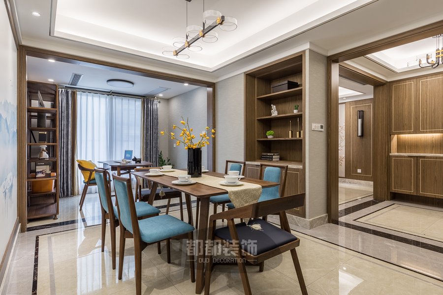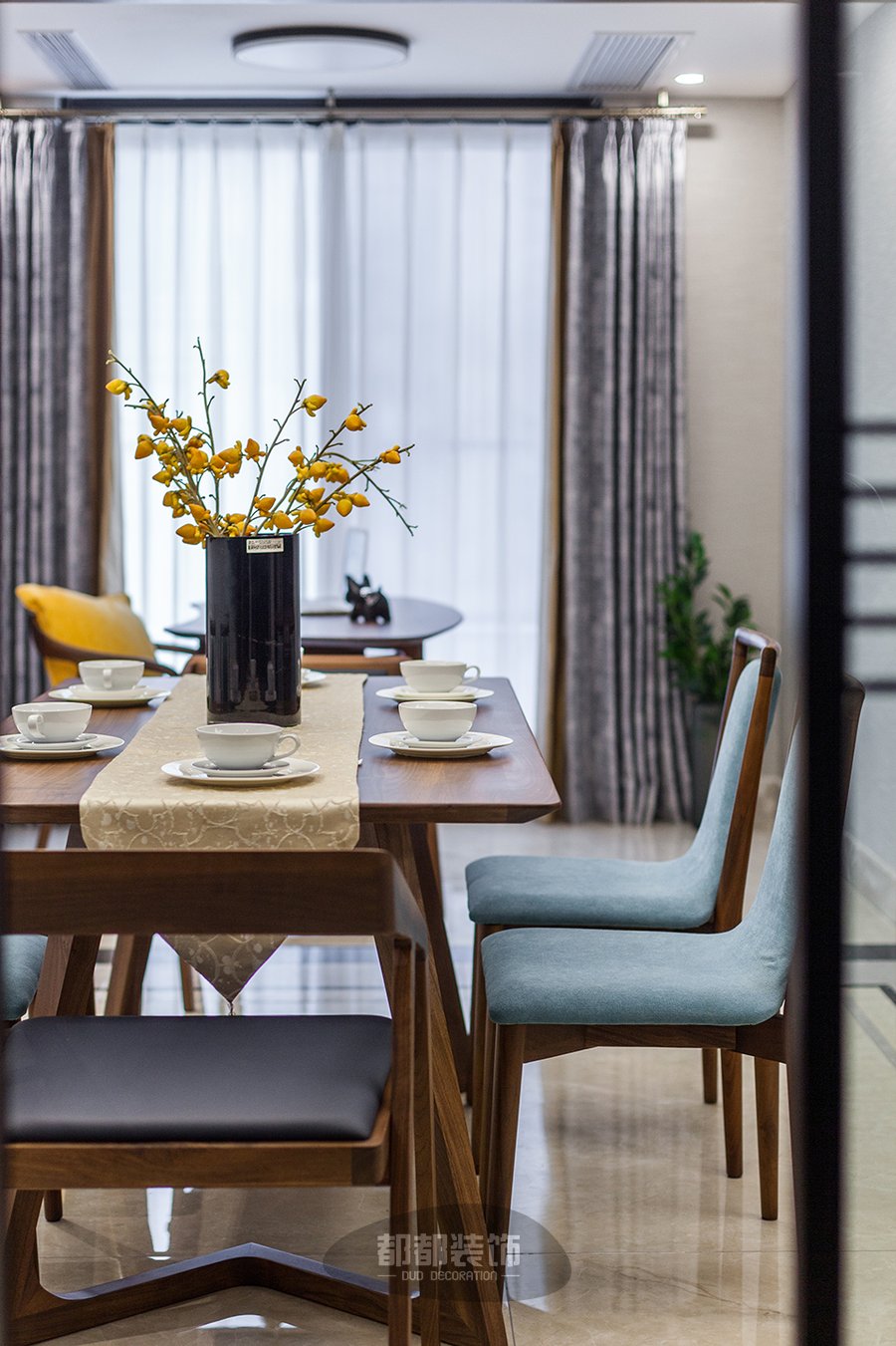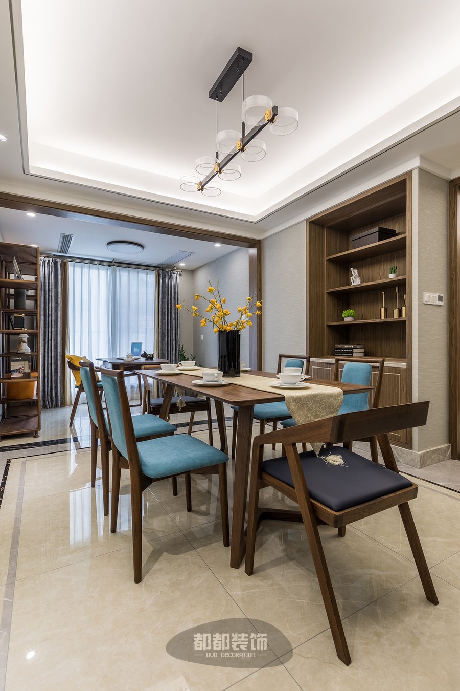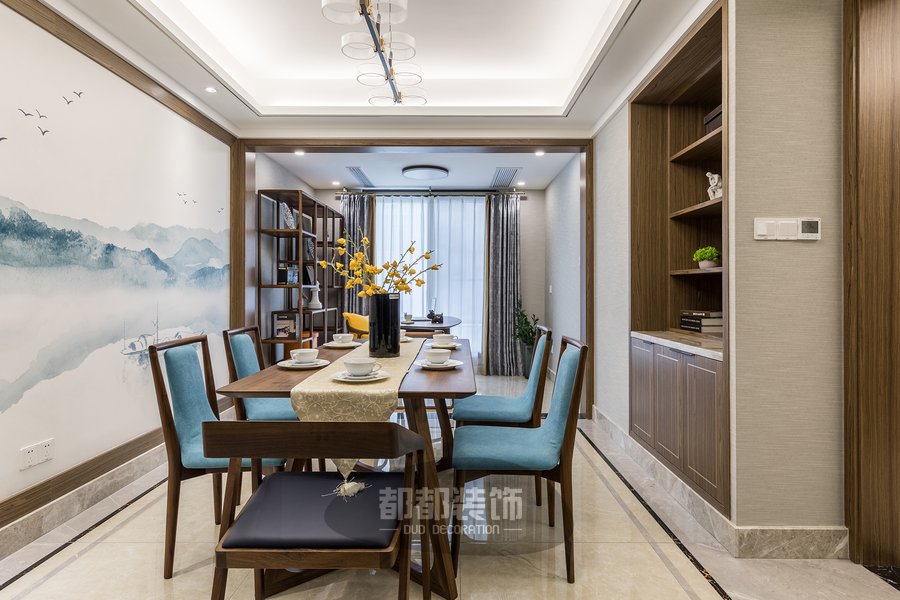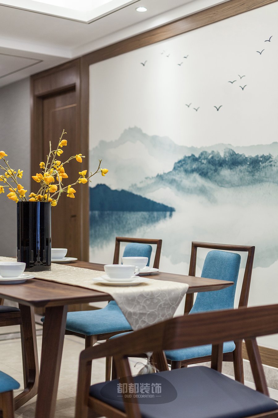 清一色的橡木元素属实有些单调,于是设计师在餐椅和背景墙上面花费了很多心思,选用了清新脱俗的黛蓝色作为点缀色,很符合中式的典雅之美。