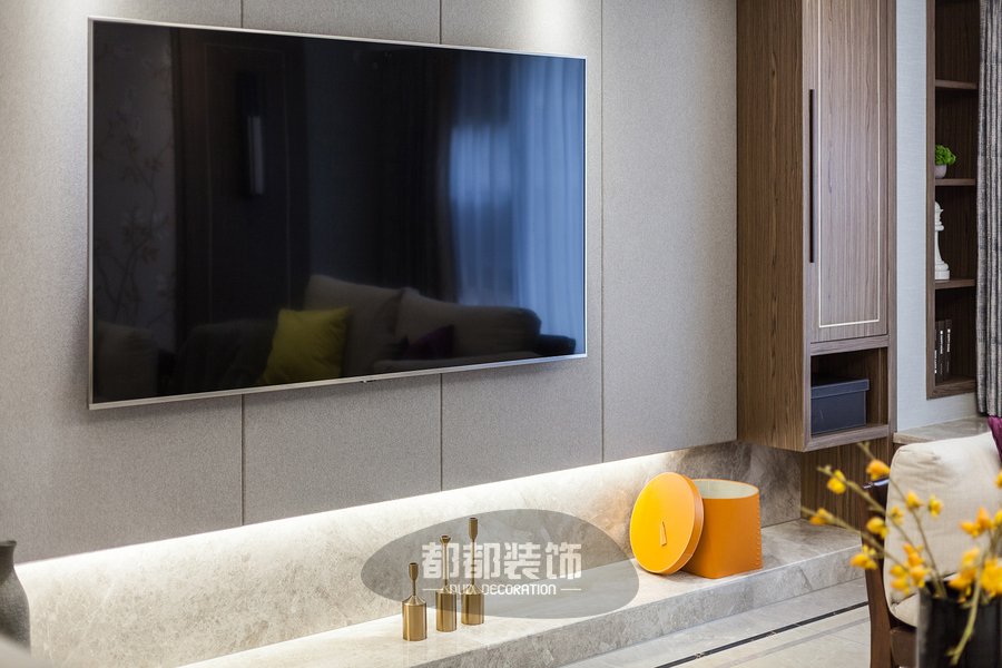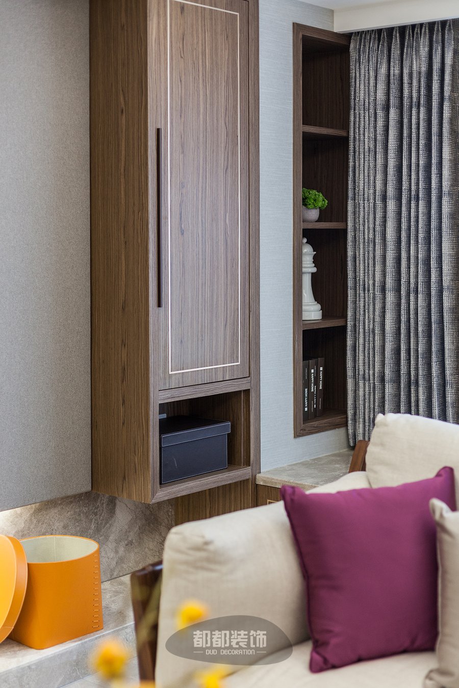 右侧定制了竖向柜体和4个开放格,让客厅的收纳更加多元化,分类有序,使用的时候更加方便快捷。