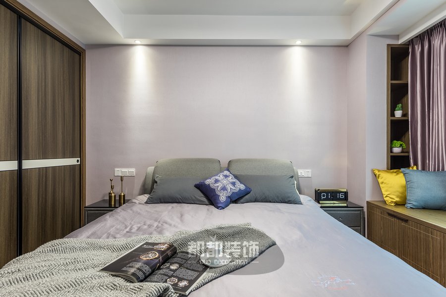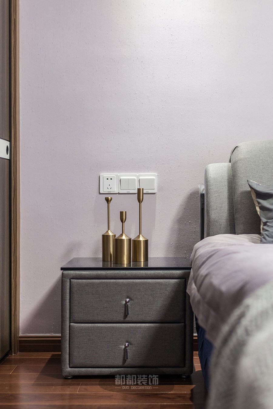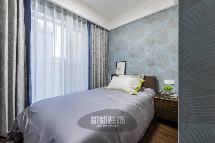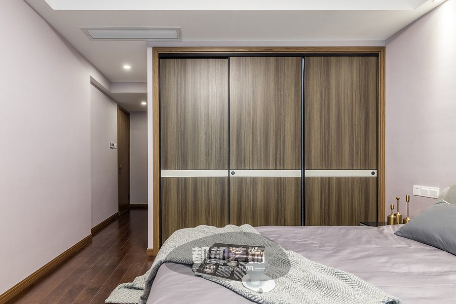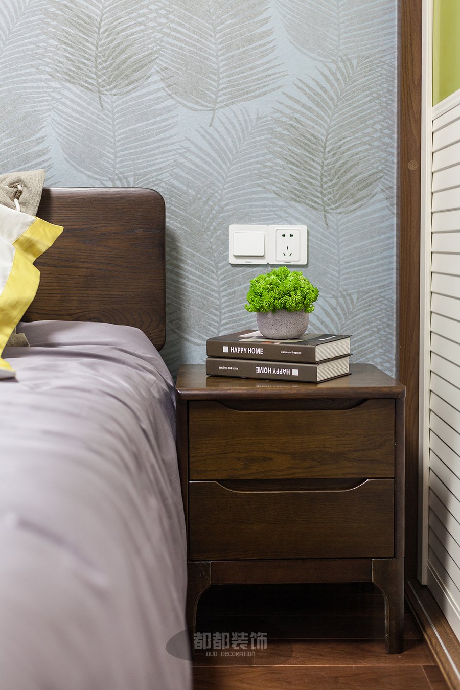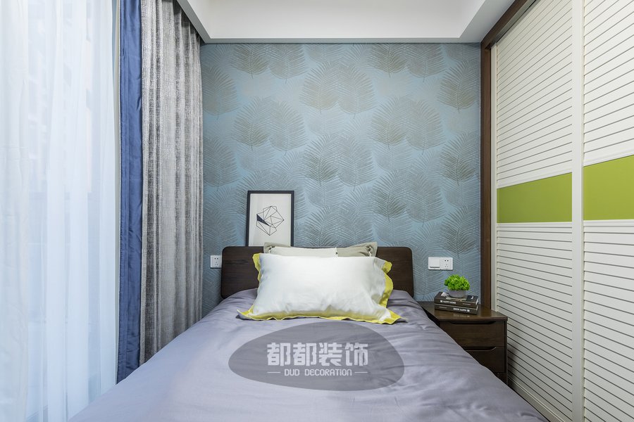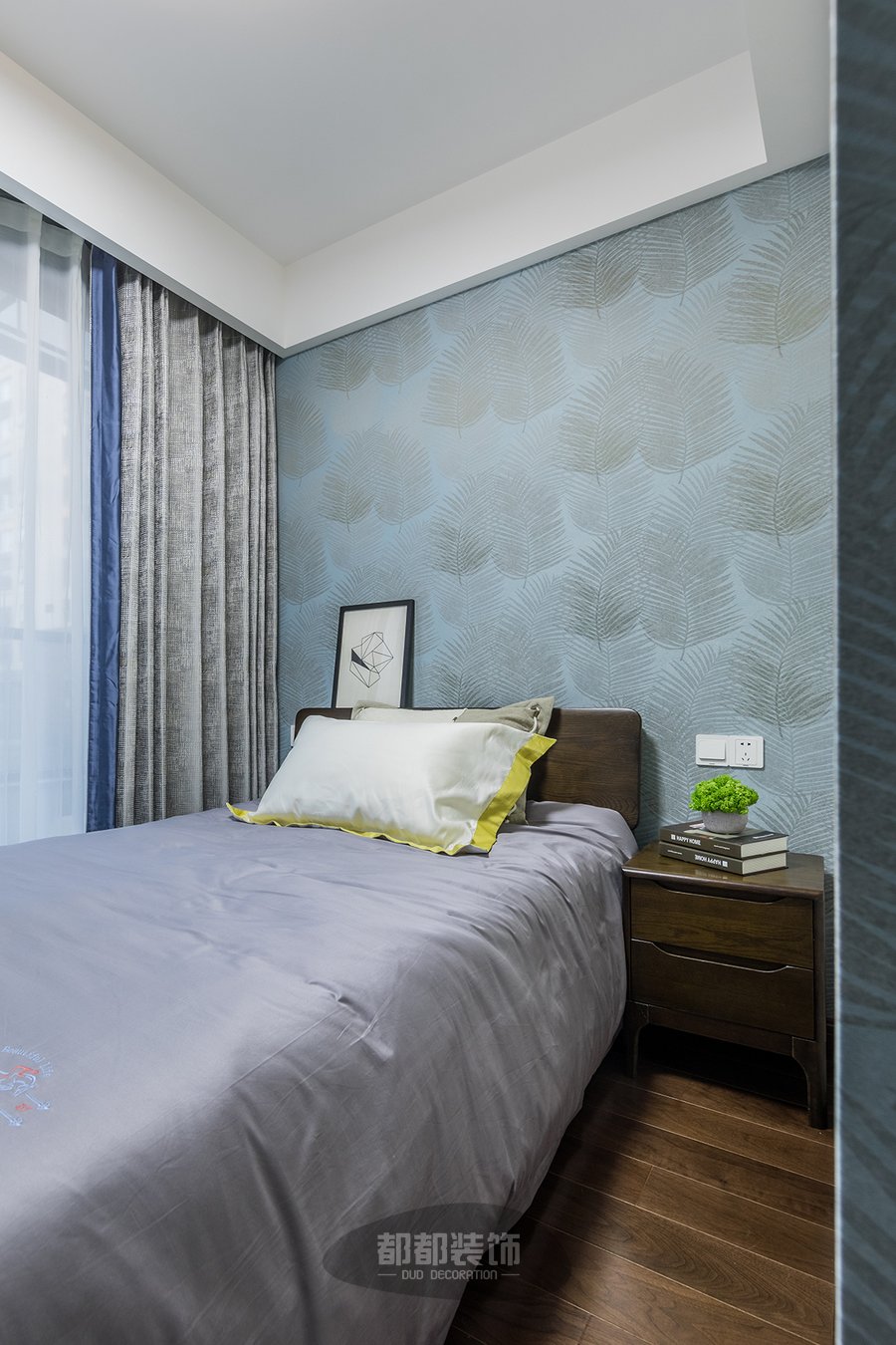 主卧的面积不算大,在确保必要的功能性上也注意了家具尺寸的把控。工字拼地板精致温暖,浅蓝+淡紫的色彩搭配,让空间更具复古的高级韵味;背景墙中加入松针叶的印花,比纯色耐脏还美观得多,强烈推荐大家有机会也可以试试。