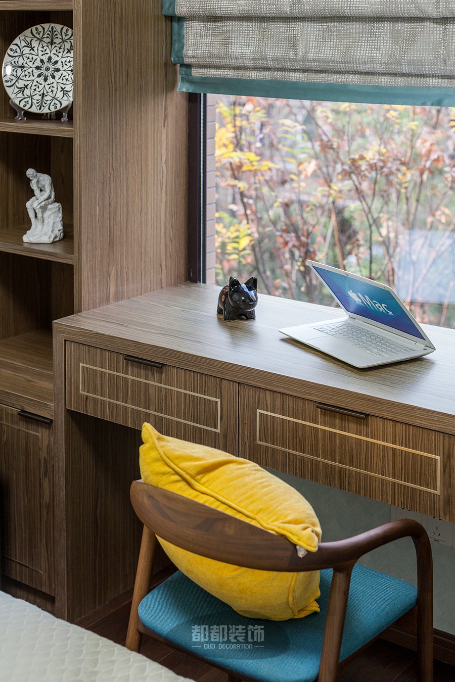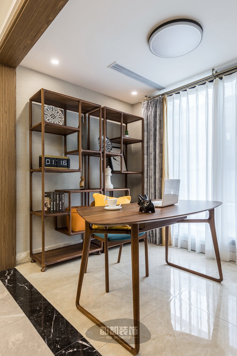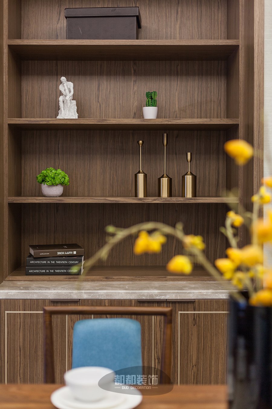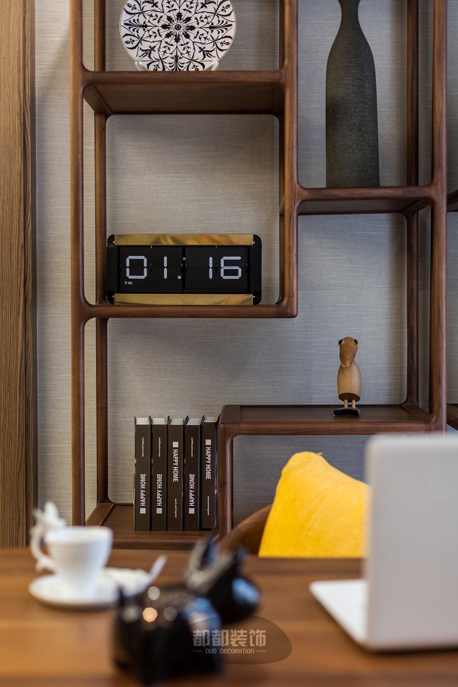 新中式的线条感极为利落,工作区的储物柜舍弃传统的笨拙柜子,换以展示功能兼具的木质立柜书架,满足了多功能性的追求,又打破先前的沉闷,极具文雅之气。