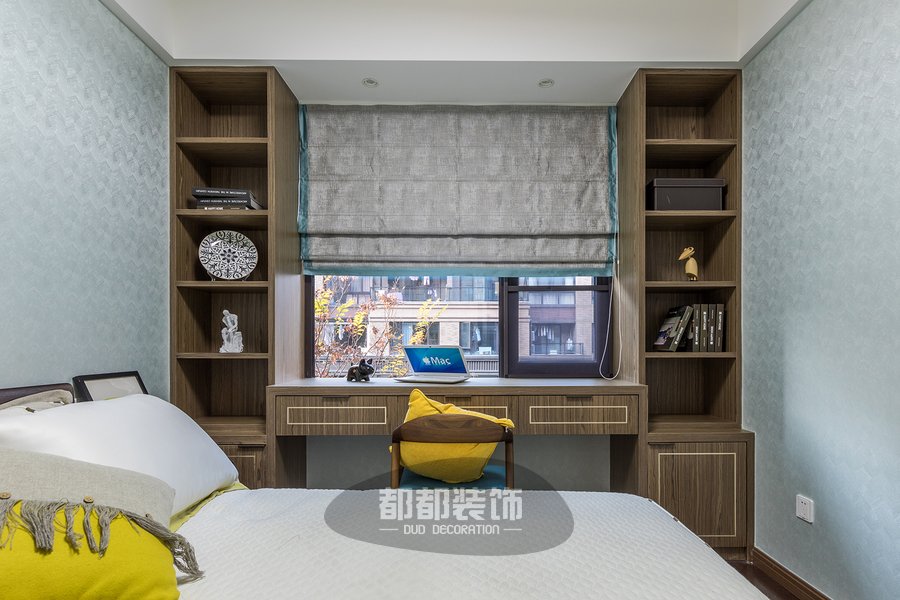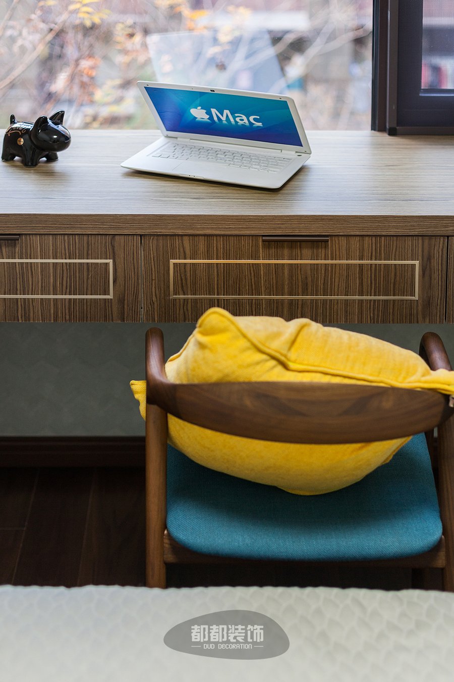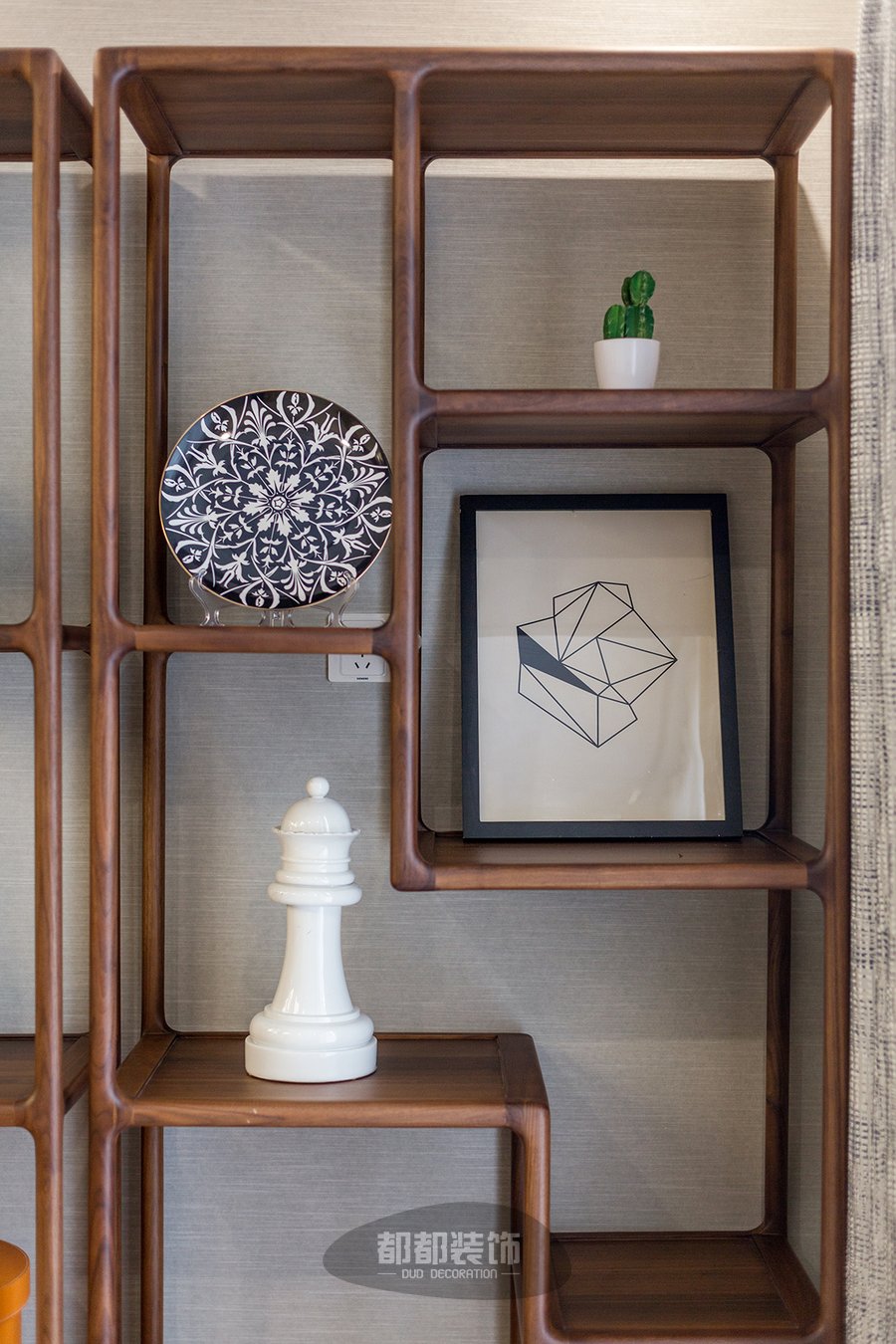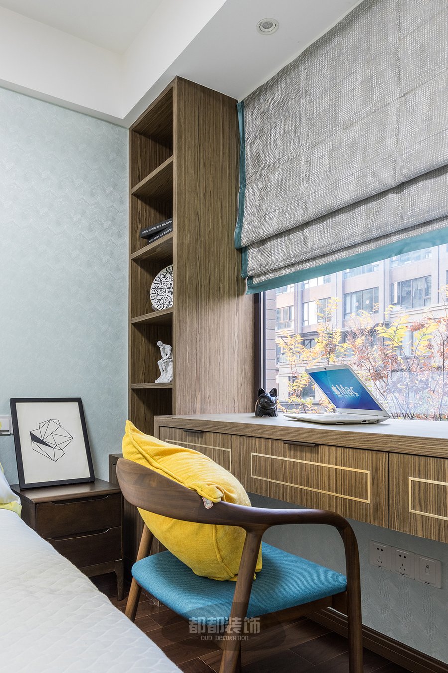 新中式的线条感极为利落,工作区的储物柜舍弃传统的笨拙柜子,换以展示功能兼具的木质立柜书架,满足了多功能性的追求,又打破先前的沉闷,极具文雅之气。